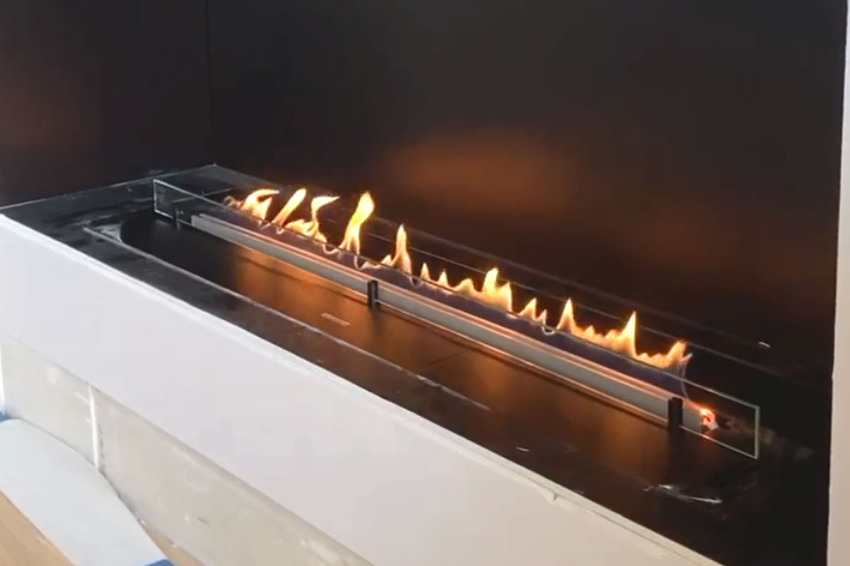 Флагманский биокамин с линией огня 990 мм встроен в низкую консоль, оформленную светлым мрамором. Пламя защищено от резких порывов воздуха экранами из жаростойкого стекла.