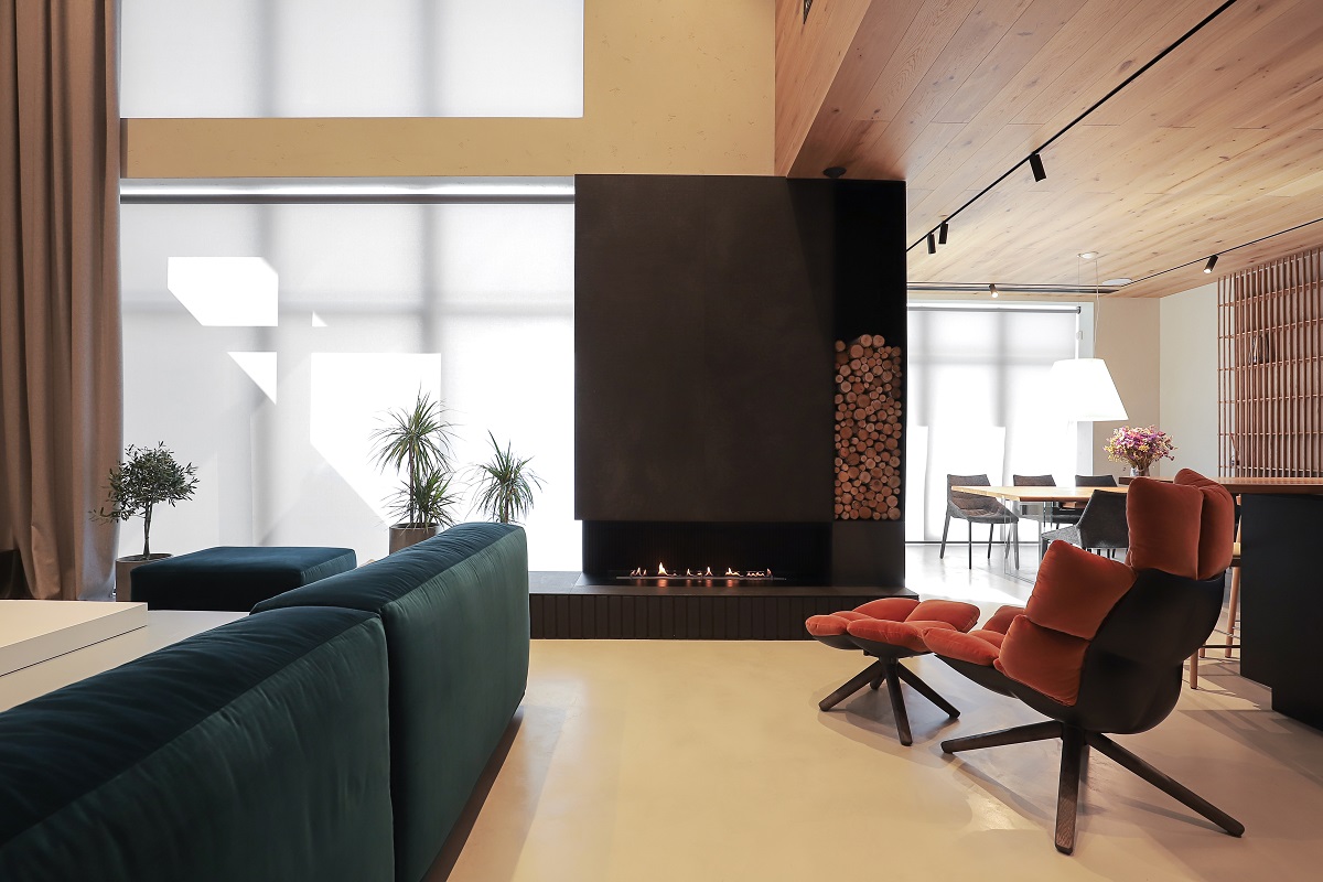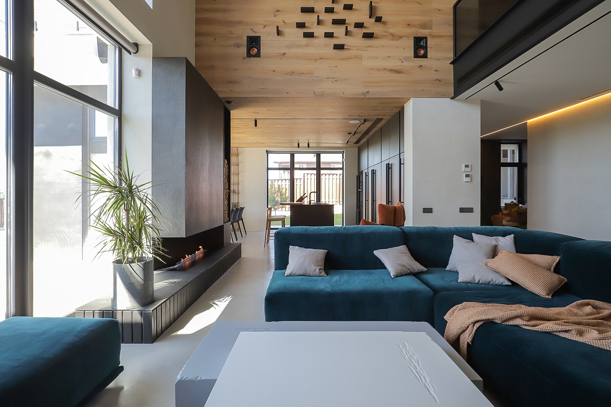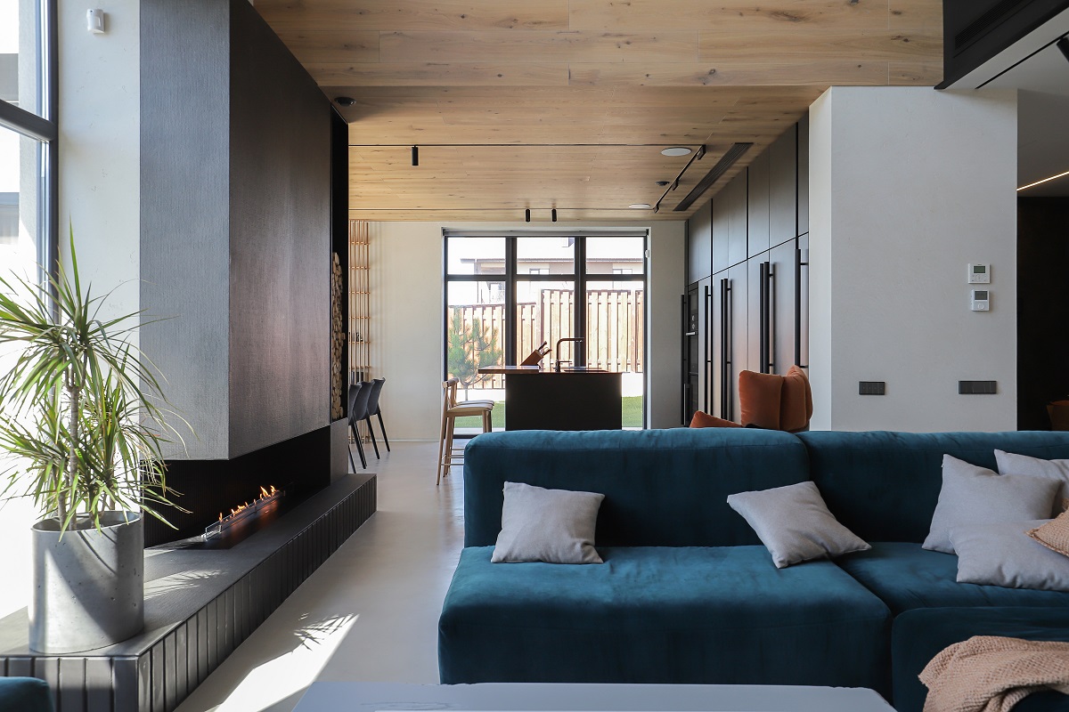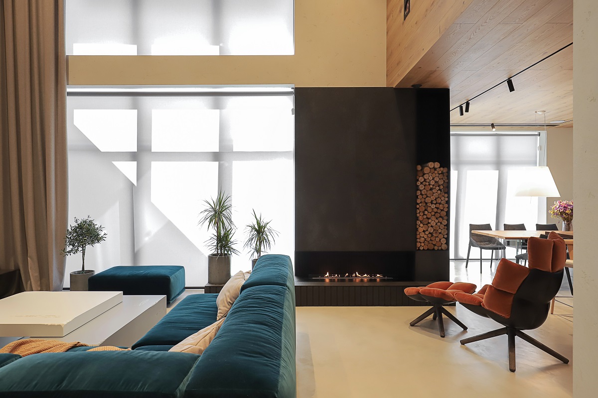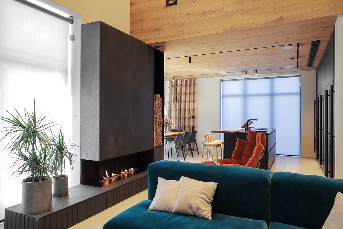 Этот великолепный проект реализованный в Днепре усилиями дизайн студии Azovskiy & Pahomova, приятен глазу, но тот, кто находился в самом доме, в первую очередь обращает внимание на аромат древесины. Инсталлированный на пересечении зоны отдыха и столовой биокамин FLA 2 Model E по-своему вносит лепту в этот аромат часть конструкции, окружающей камин используется, как ниши для хранения поленьев.