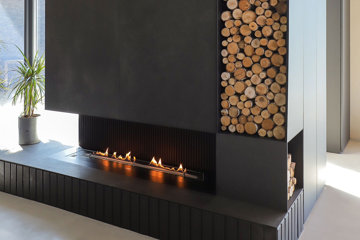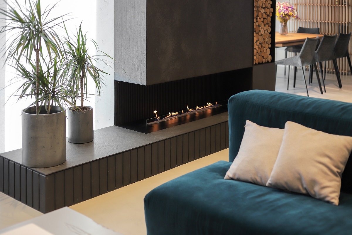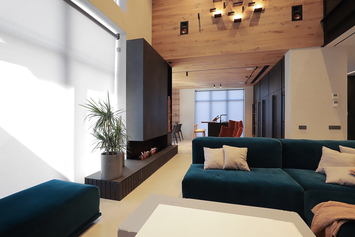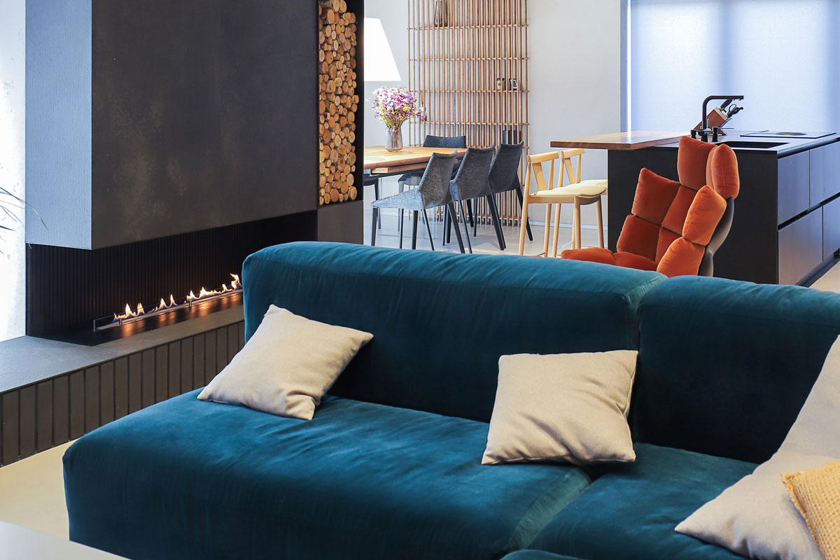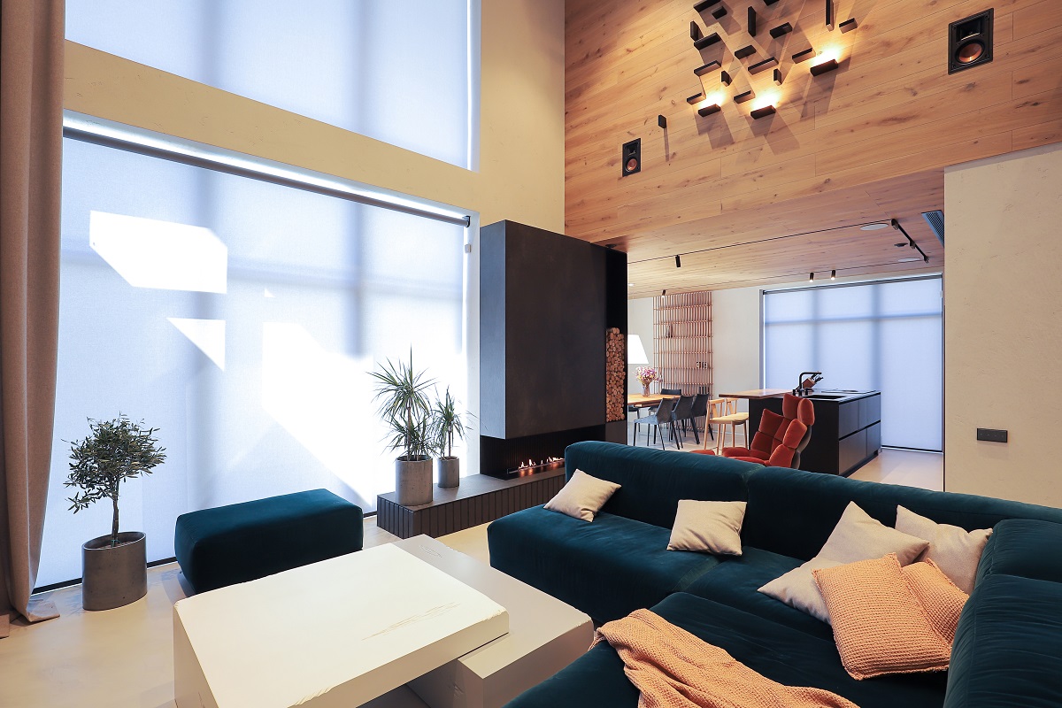 Этот великолепный проект реализованный в Днепре усилиями дизайн студии Azovskiy & Pahomova, приятен глазу, но тот, кто находился в самом доме, в первую очередь обращает внимание на аромат древесины. Инсталлированный на пересечении зоны отдыха и столовой биокамин FLA 2 Model E по-своему вносит лепту в этот аромат часть конструкции, окружающей камин используется, как ниши для хранения поленьев.