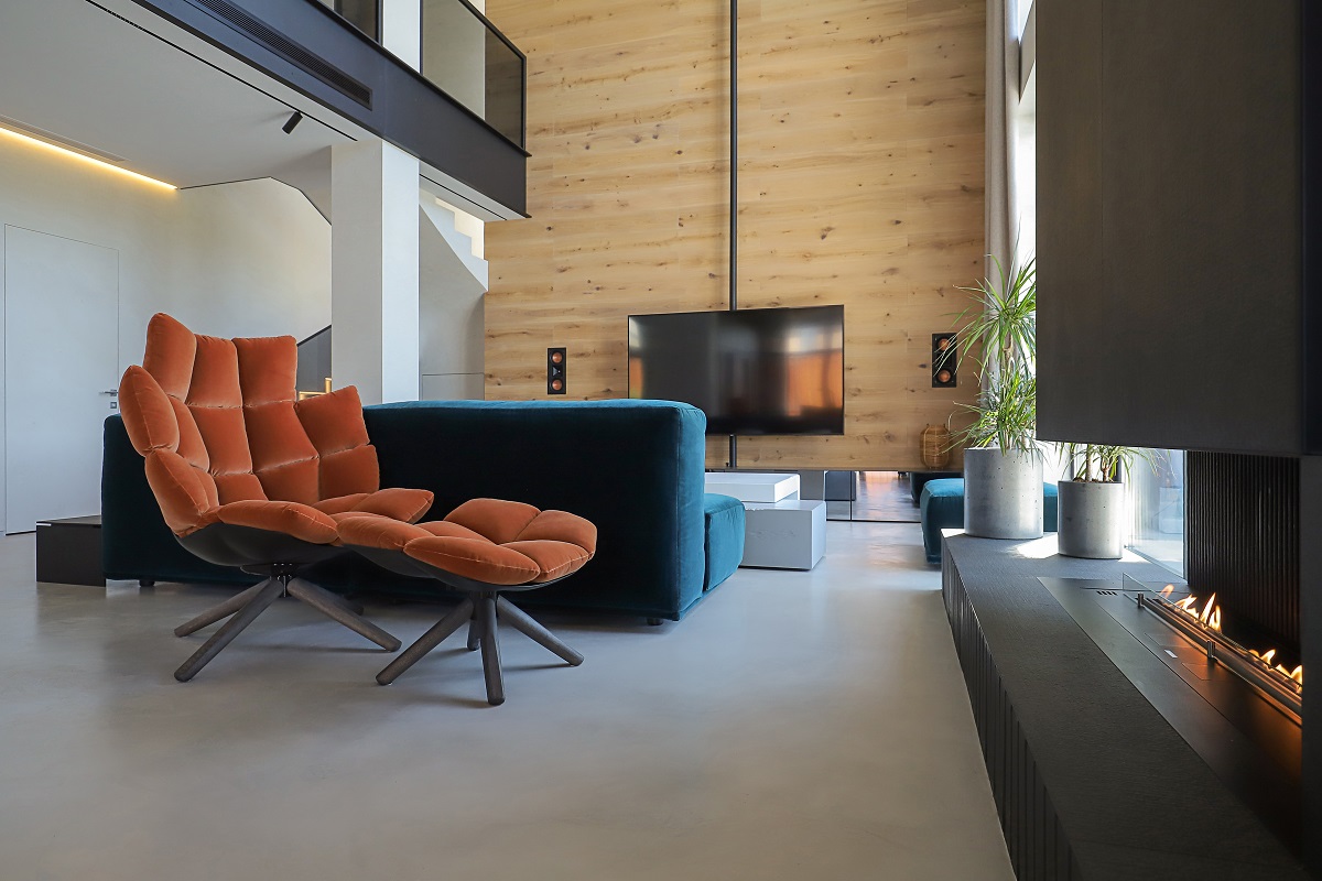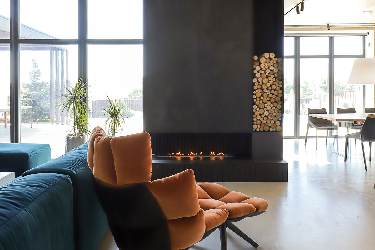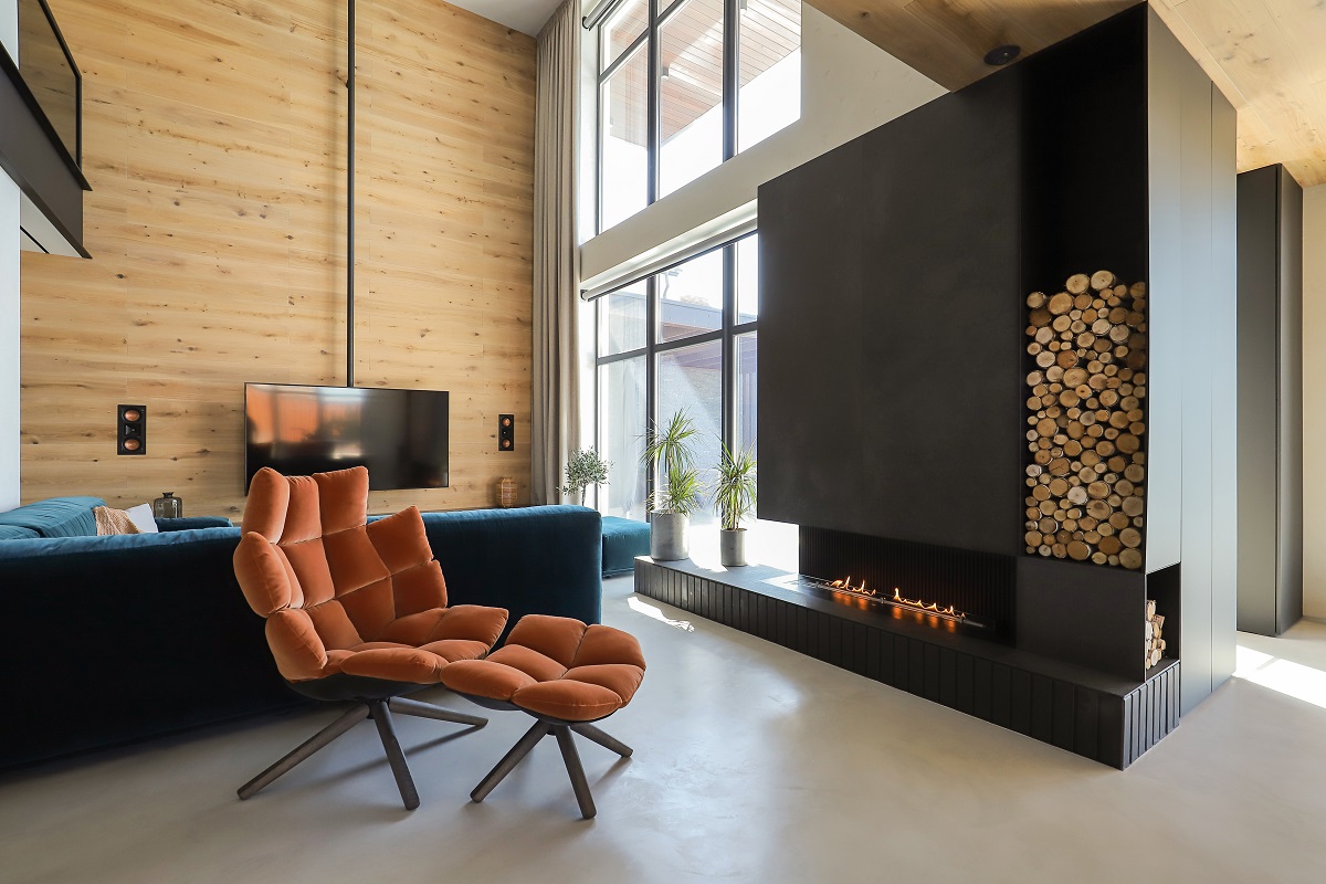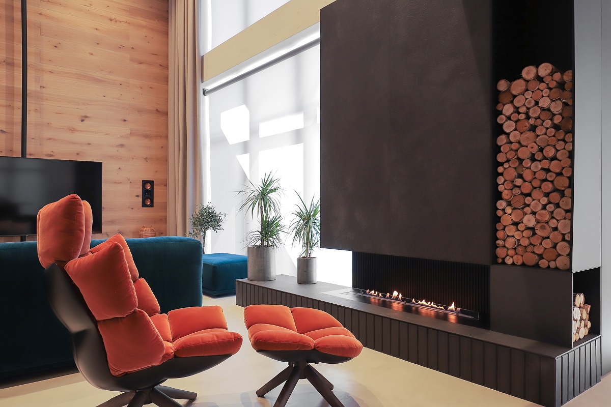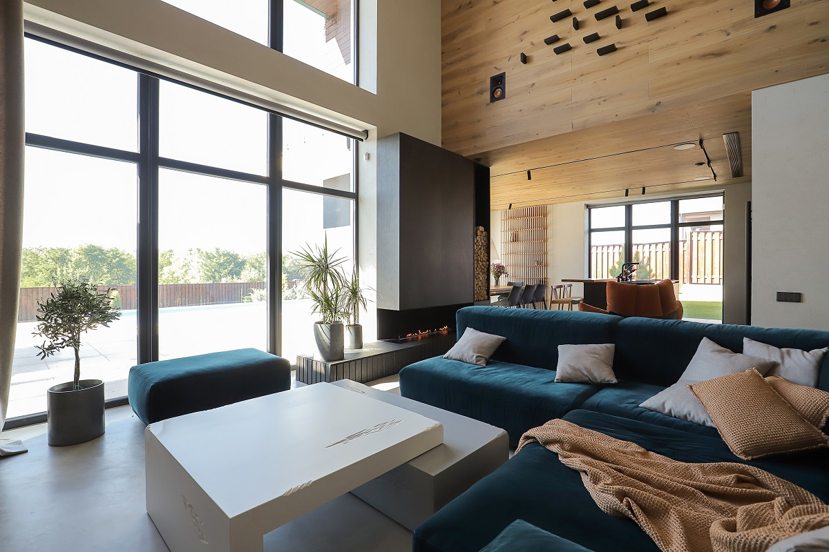 Этот великолепный проект реализованный в Днепре усилиями дизайн студии Azovskiy & Pahomova, приятен глазу, но тот, кто находился в самом доме, в первую очередь обращает внимание на аромат древесины. Инсталлированный на пересечении зоны отдыха и столовой биокамин FLA 2 Model E по-своему вносит лепту в этот аромат часть конструкции, окружающей камин используется, как ниши для хранения поленьев.