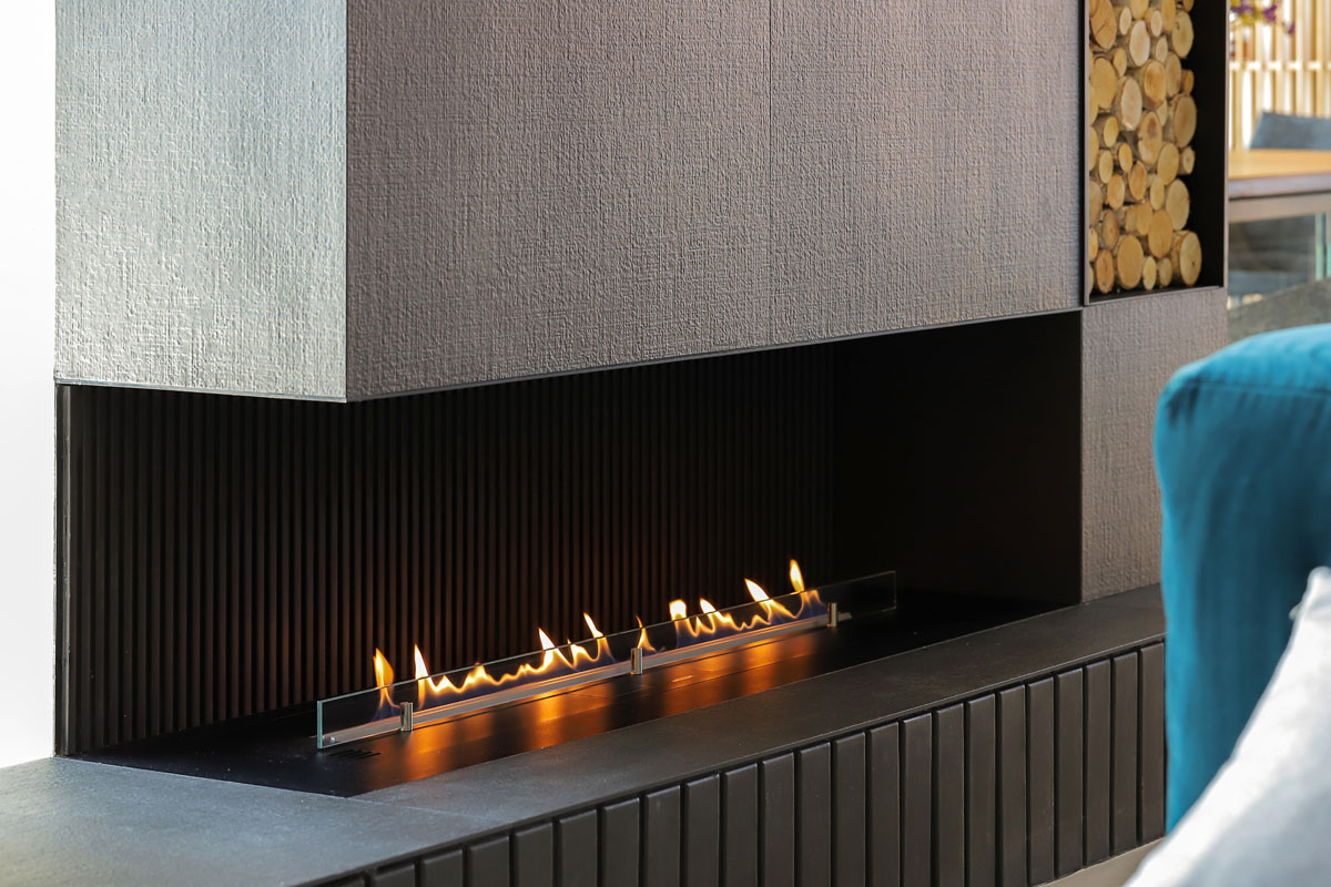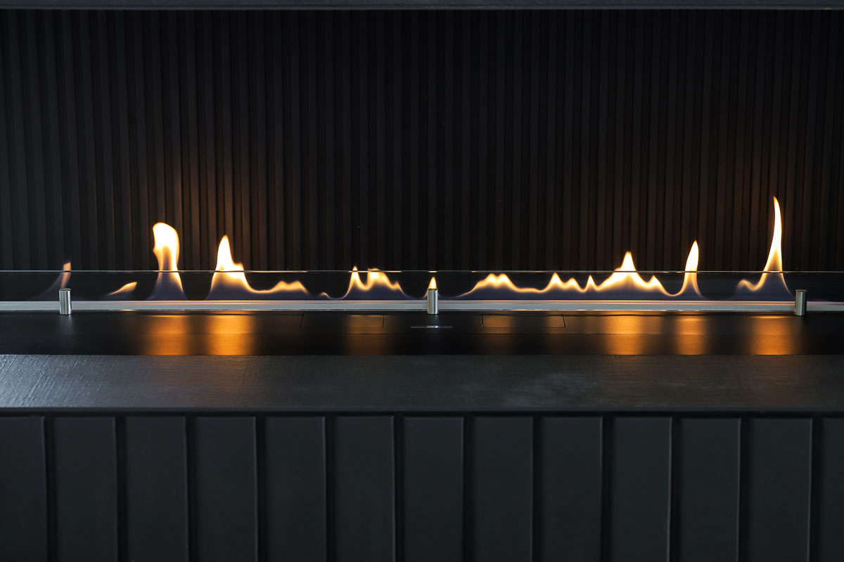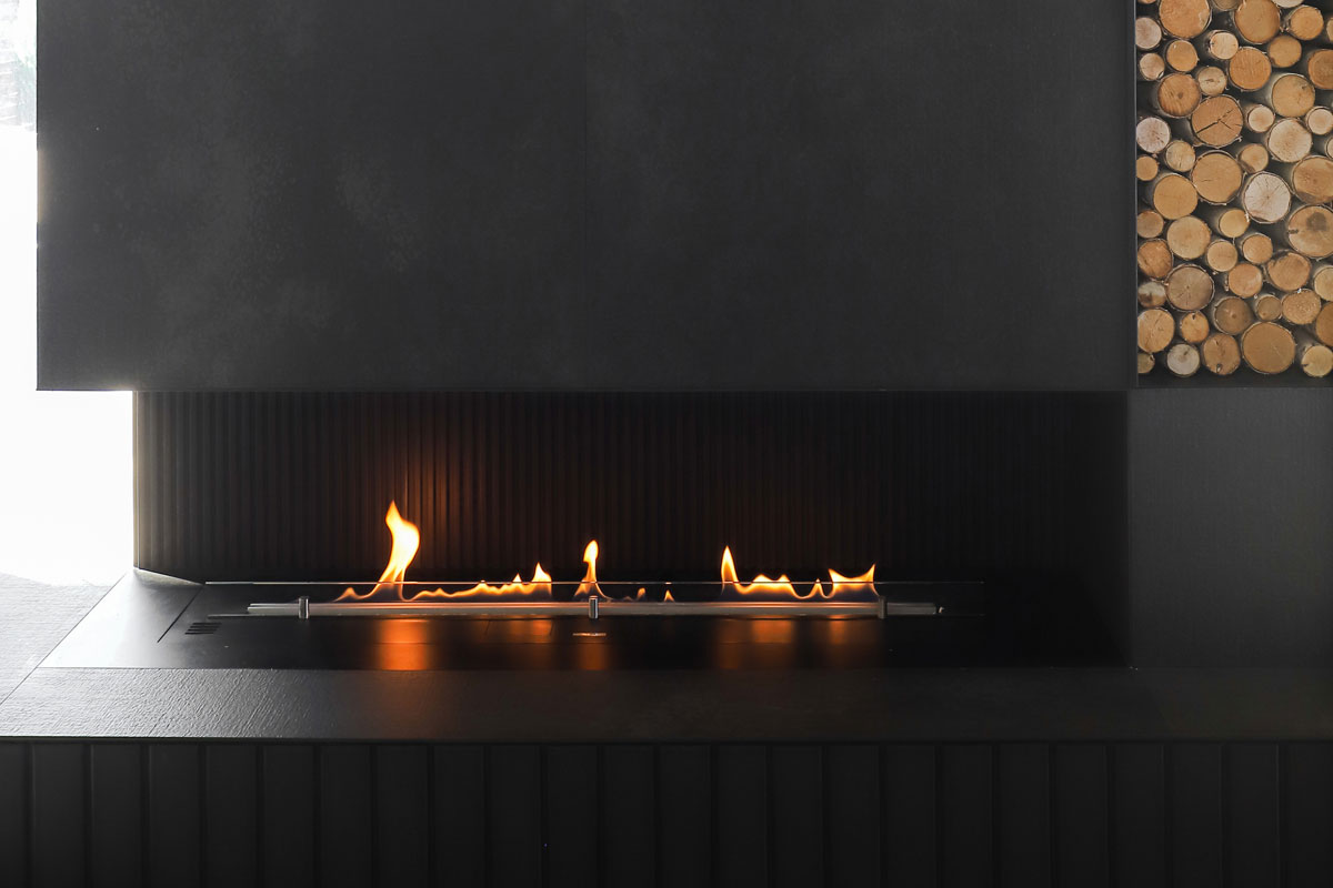 Камин получился открытым для обзора с двух сторон: фронтальной и одной боковой. Для защиты пламени от сквозняков вдоль линии огня установлена панель из жаропрочного закаленного стекла. Задняя стенка ниши оформлена черным рифленым металлом, на таком фоне яркое пламя смотрится особенно зрелищно,