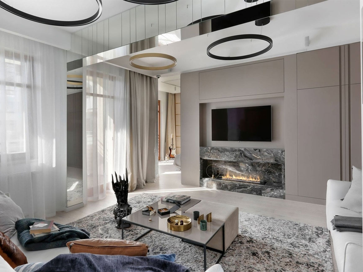 Кстати, последний висит непосредственно над нишей, в которой установлен биокамин. Чтобы исключить контакт нагретого воздуха с плазмой, телевизор встроили в небольшую по глубине нишу, согласно рекомендациям от производителя камина.