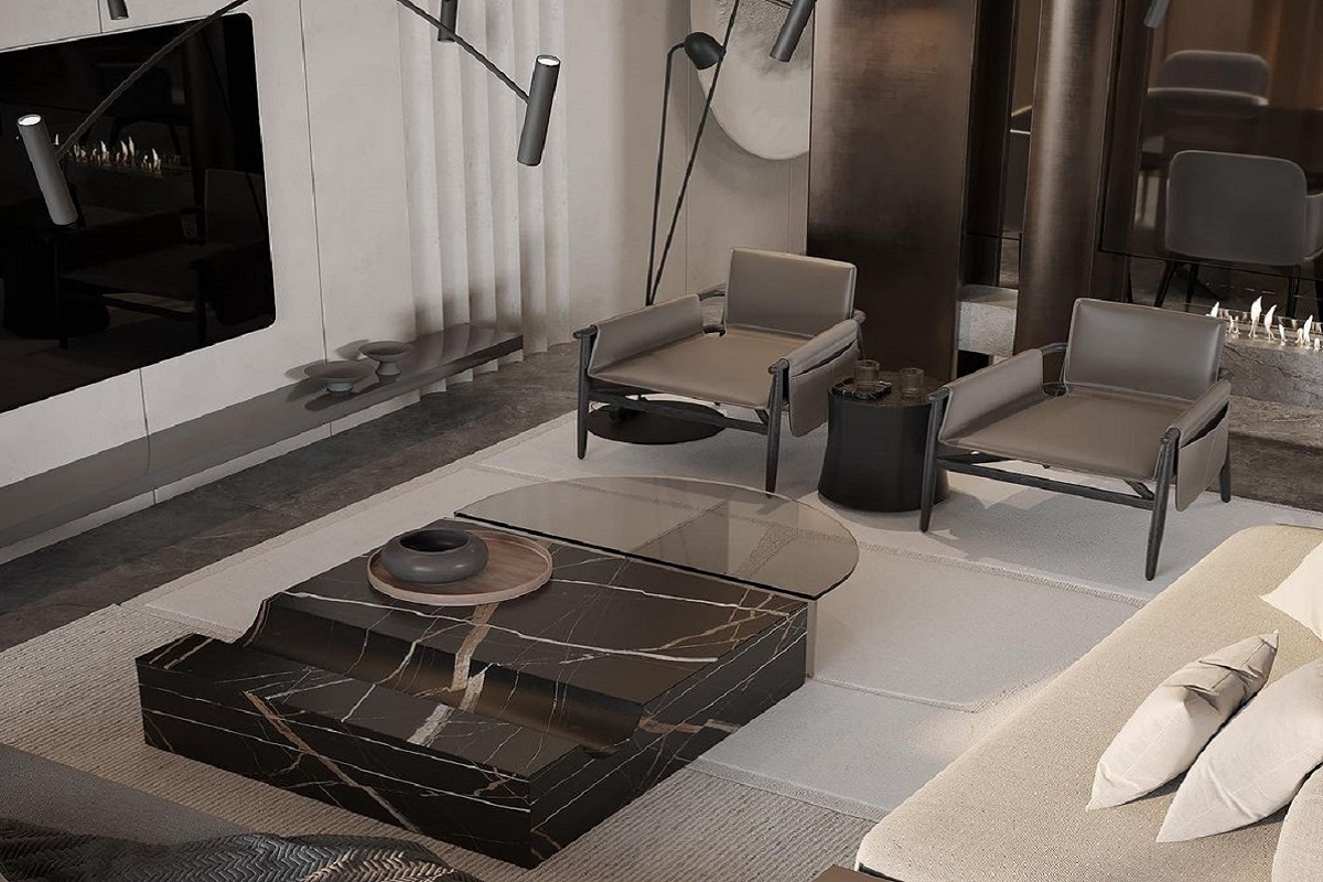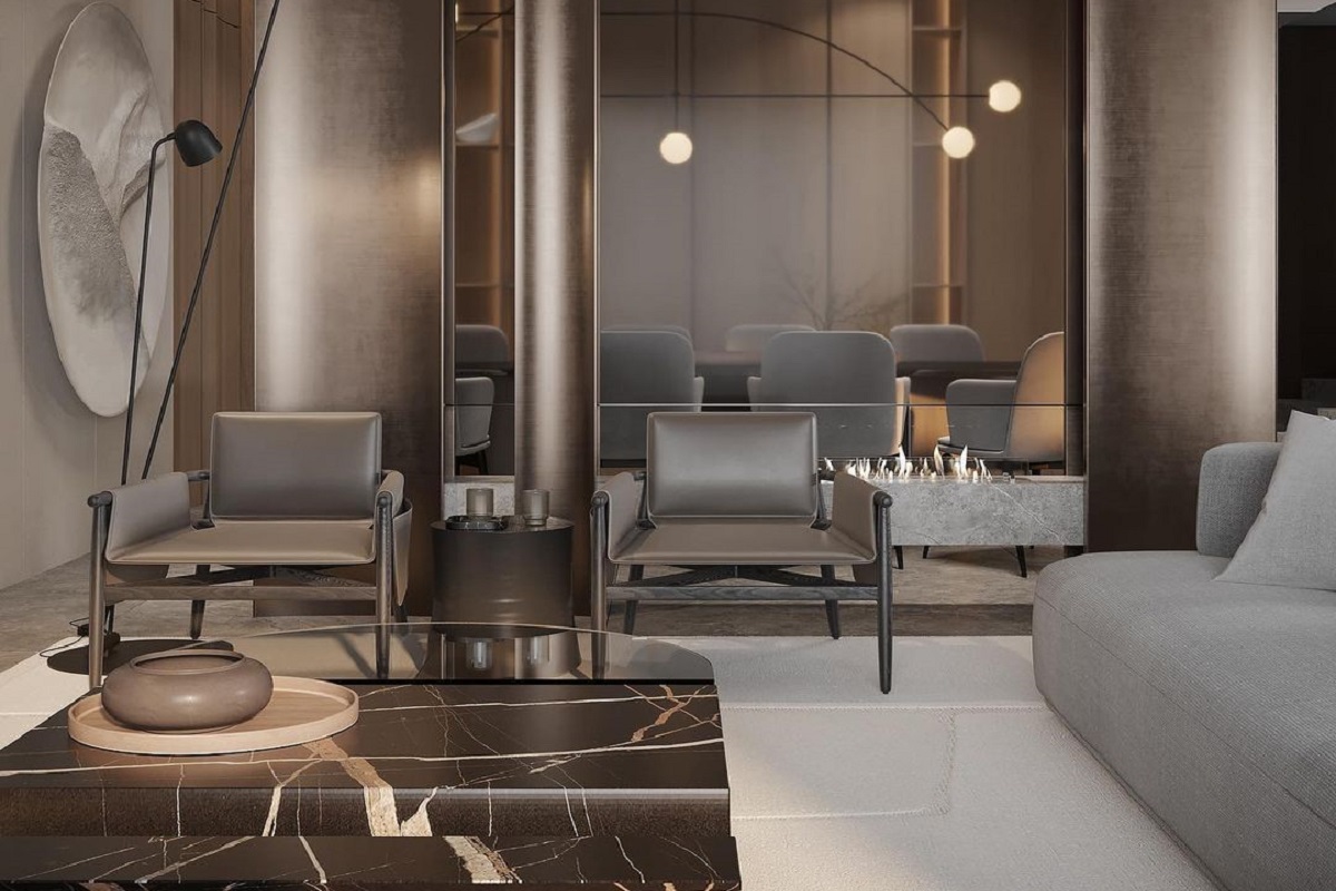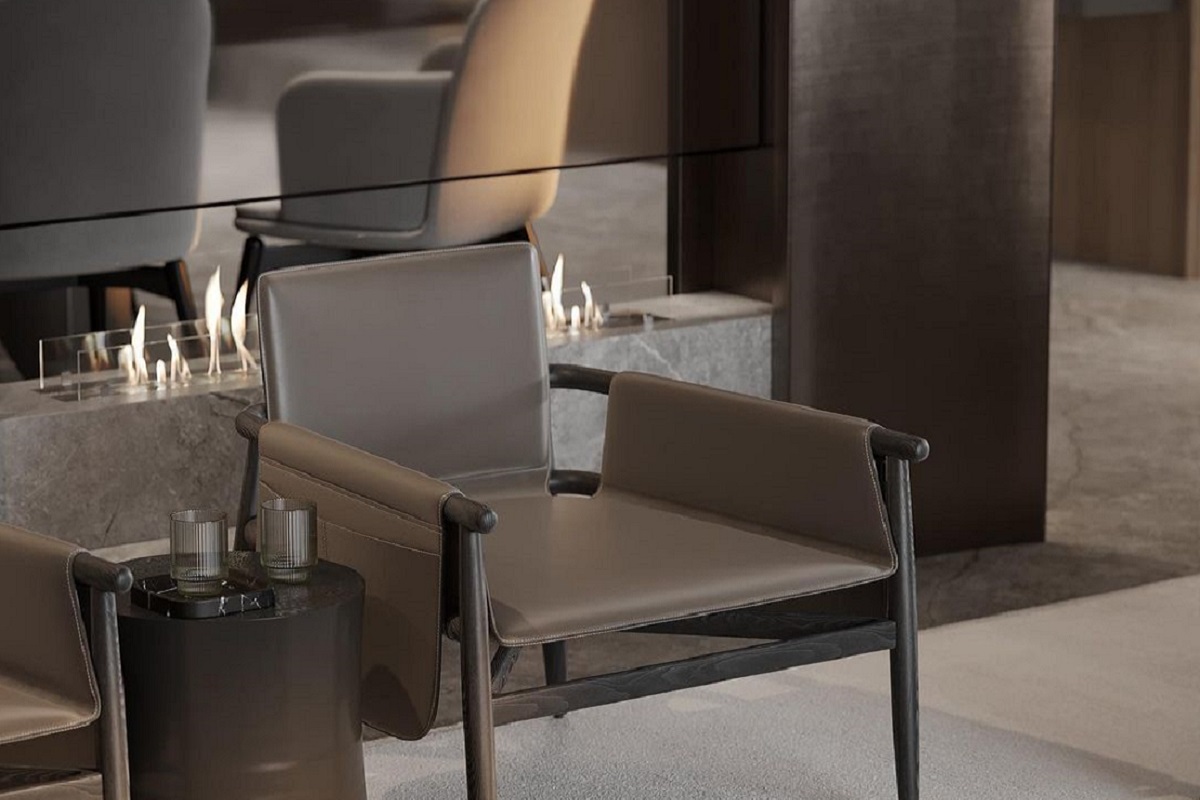 Никакой вычурности, только тёплые оттенки, простота линий, но допустимы и элементы декора в виде мраморного журнального столика, красивой панорамы у обеденного стола и автоматического биокамина FLA 3 с длиной линии огня 1190 мм.