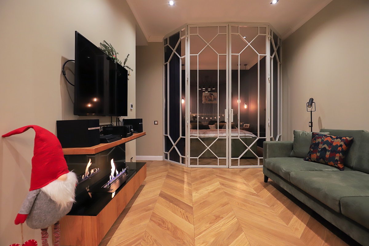 Биокамин, встроенный в мебельную консоль, не единственная изюминка интерьера. Любой, кто попадет в квартиру, обратит внимание на стеклянную перегородку, отделяющую спальню от гостиной.