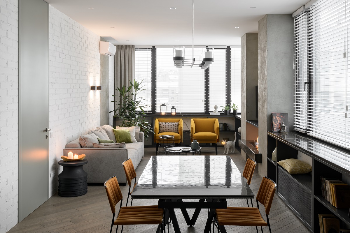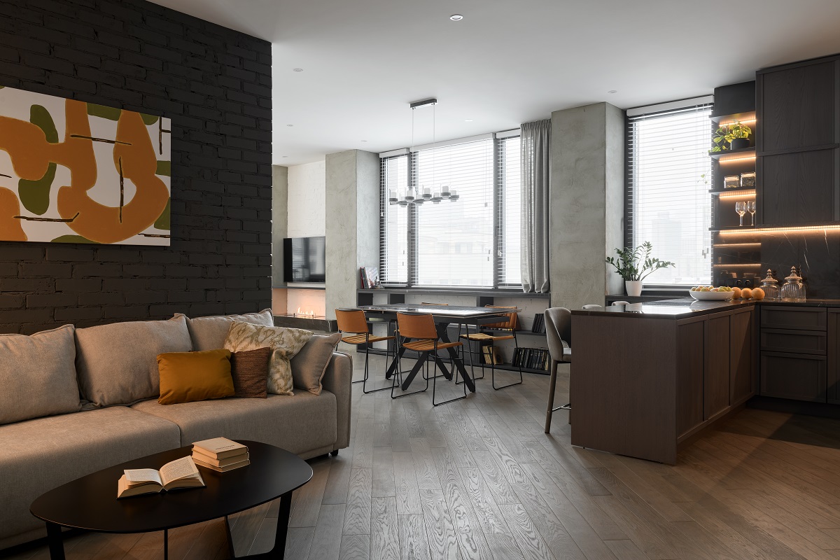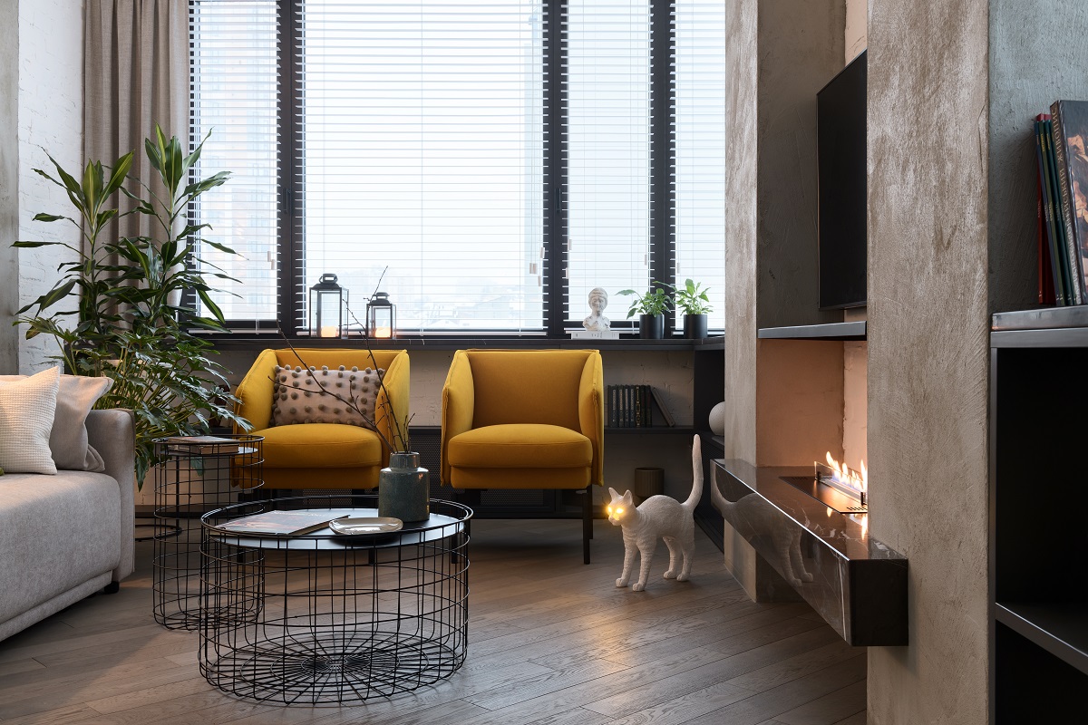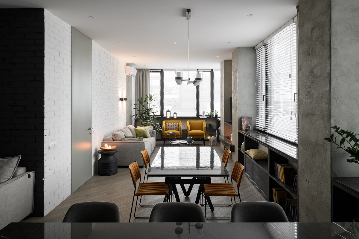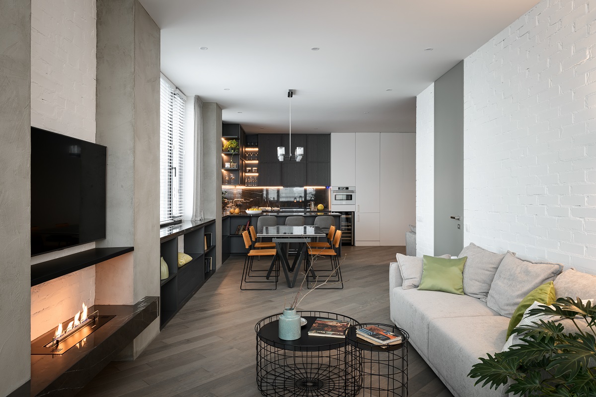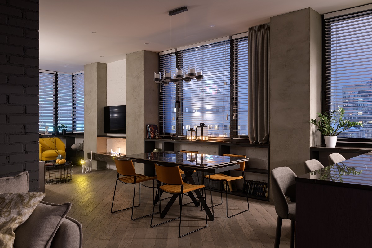 В целом интерьер пространства выполнен в урбанистическом стиле, с присущей ему монохромностью в отделке. А живой огонь камина, натуральные материалы в отделке(дерево, текстиль)разбавляют типичные атрибуты “городских джунглей” (бетон, стекло, кирпич), создавая невероятно гармоничный альянс и то, что называется домашним уютом
