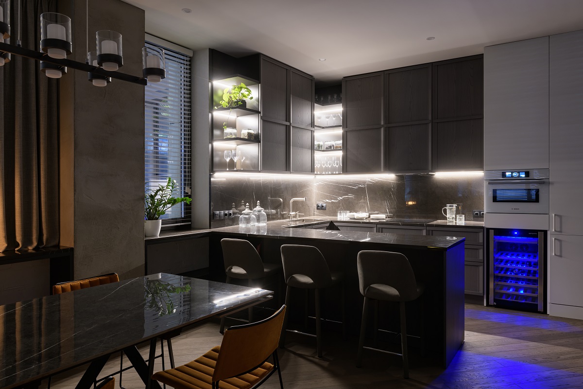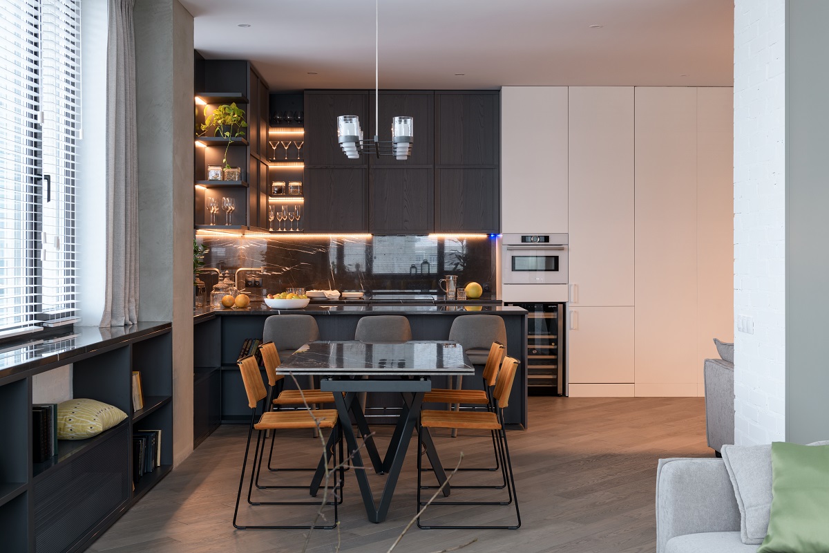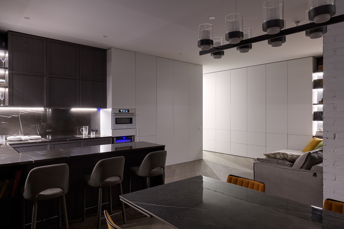 Поскольку хозяева квартиры люди гостеприимные, в планировке особое внимание было уделено локациям для дружественных встреч и посиделок. Автоматический биокамин Primefire стал фокусной точкой зоны отдыха с мягкой мебелью и панорамным видом из окон