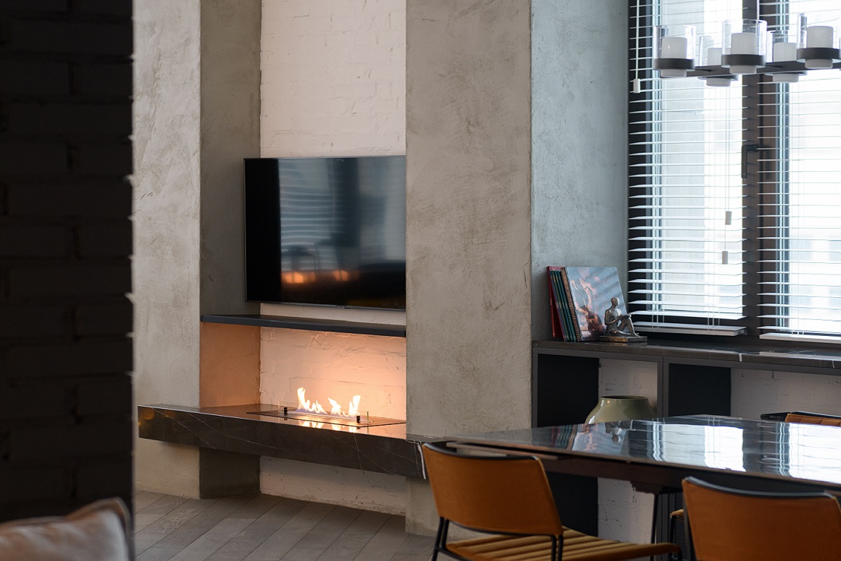 В проекте использован встраиваемый камин на биотопливе от компании Planika с линией огня 700 мм.