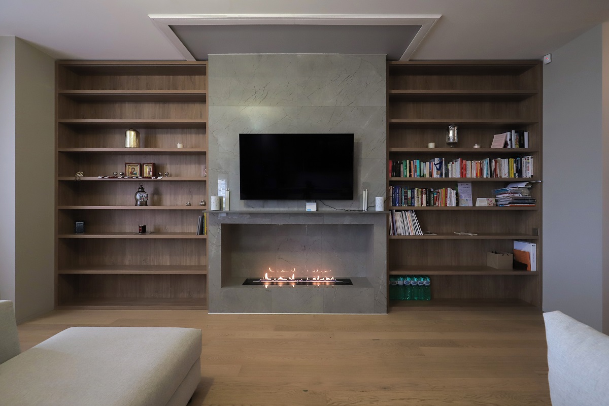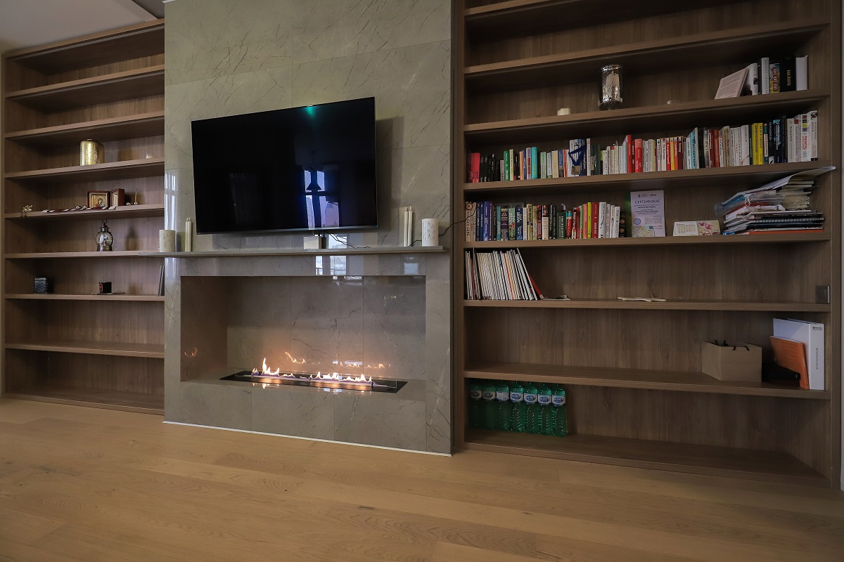 Неудивительно, что соседями каминного портала стали два книжных шкафа. Домашней библиотеке ничего не угрожает, когда источником живого огня по соседству является биоэтаноловый камин.