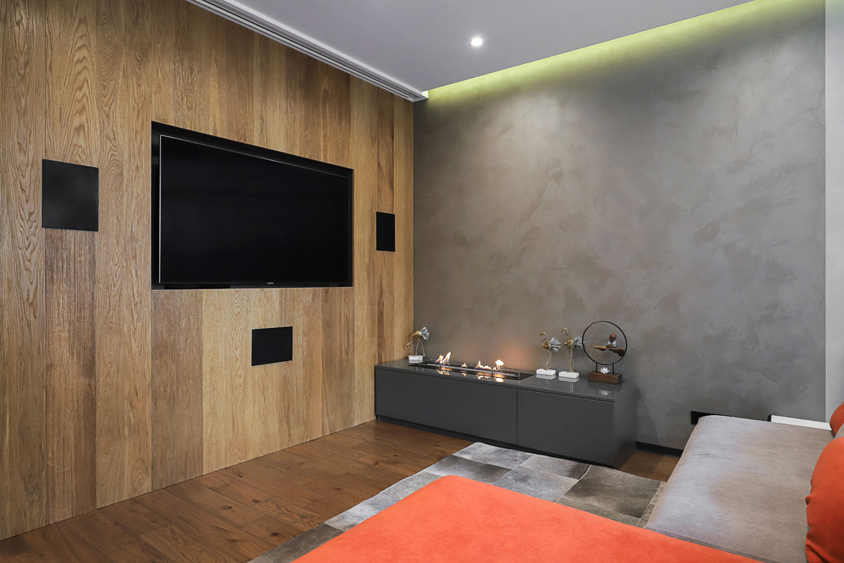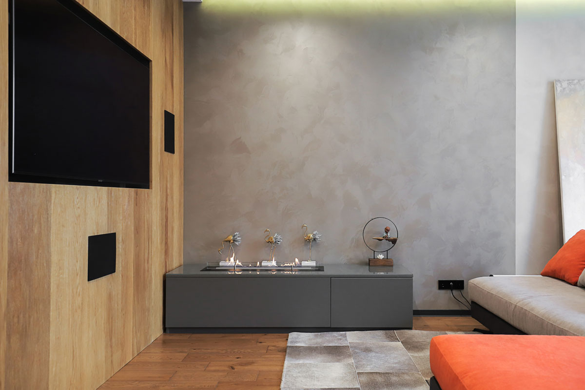 Мягкий диван, навесной широкоэкранный телевизор со встроенной акустикой и биоэтаноловый камин — все ,что нужно для уютного и комфортного времяпрепровождения в узком семейном кругу или в одиночестве.