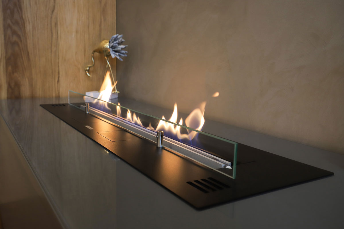 Интеллектуальный биокамин встроен в мебельную консоль, верхняя плита которой оформлена негорючим материалом. Учитывая тот факт, что для инсталляции не требуется дымоход и дополнительные решетки вентиляции, можно создавать интересные конструкции со встроенным камином, в том числе монтировать его в стенные ниши и каминные порталы.