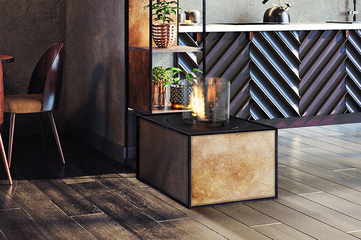 Оснащен инновационными датчиками безопасности, микропроцессором, фирменной технологией BEV (сжигание этаноловых испарений вместо жидкого топлива) – этот компактный биокамин может быть встроен в столы, тумбы, пьедесталы и другие декоративные конструкции.