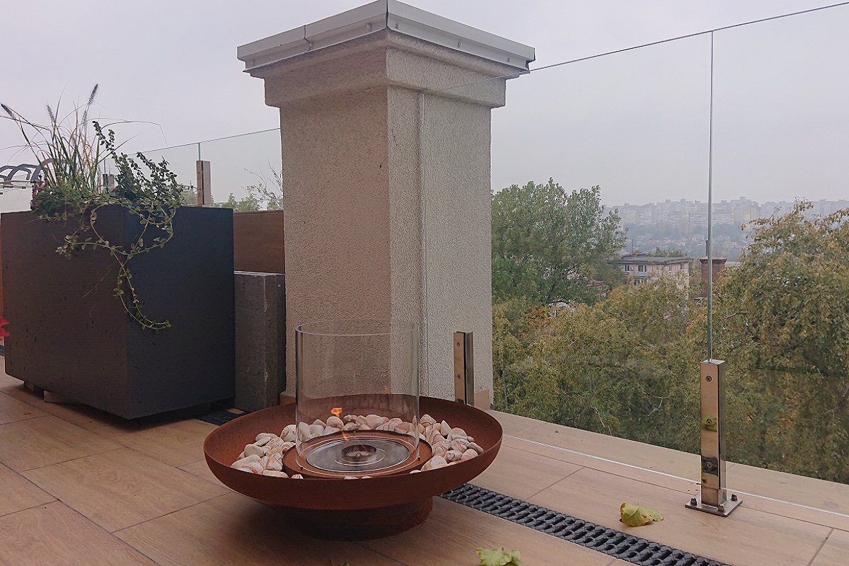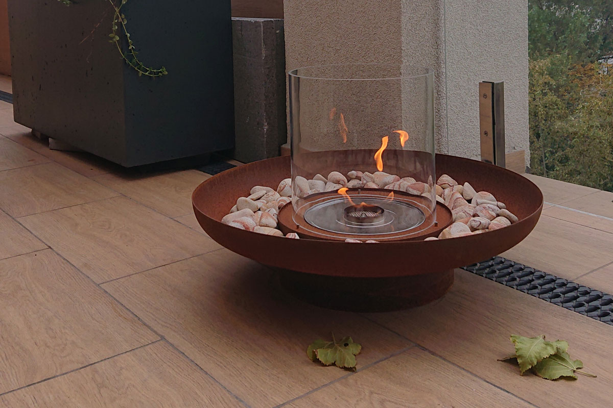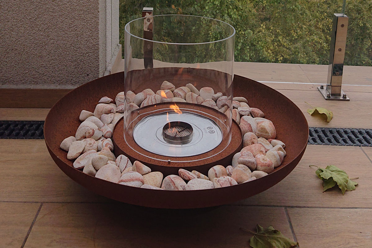 Этот переносной красавчик выполнен в виде костровой чаши с защитным цилиндрическим абажуром из закаленного стекла. Чаша изготовлена из устойчивого к капризам природы кортена.