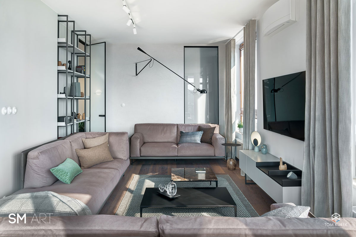 Днем эта квартира полна солнечного света, а вечером, приходит время искусственной иллюминации и света живого огня биокамина.
