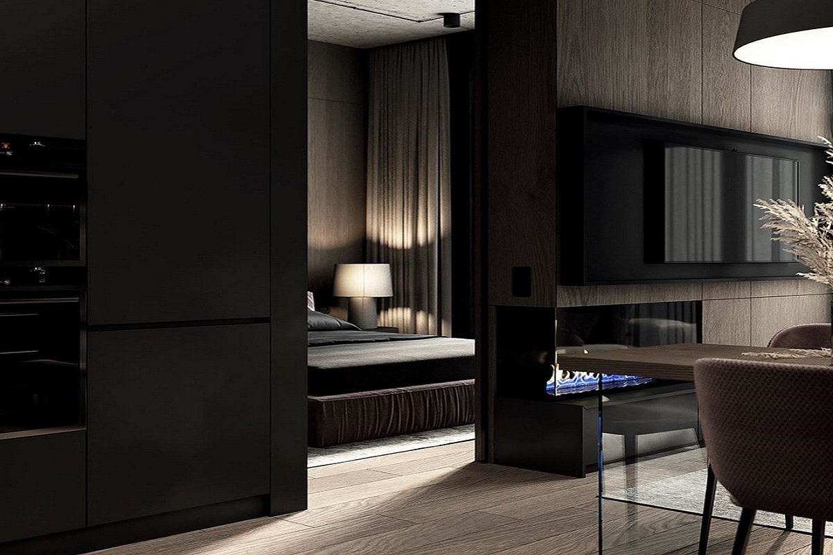 Посмотрите, как преображается гостиная, когда в ней есть источник живого огня. Автоматический биокамин инсталлирован в межкомнатной перегородке, в нише с открытой лицевой и боковой сторонами. Внутренняя часть ниши отделана черным глянцевым материалом, отражающим блики пламени, делая его еще более объемным.