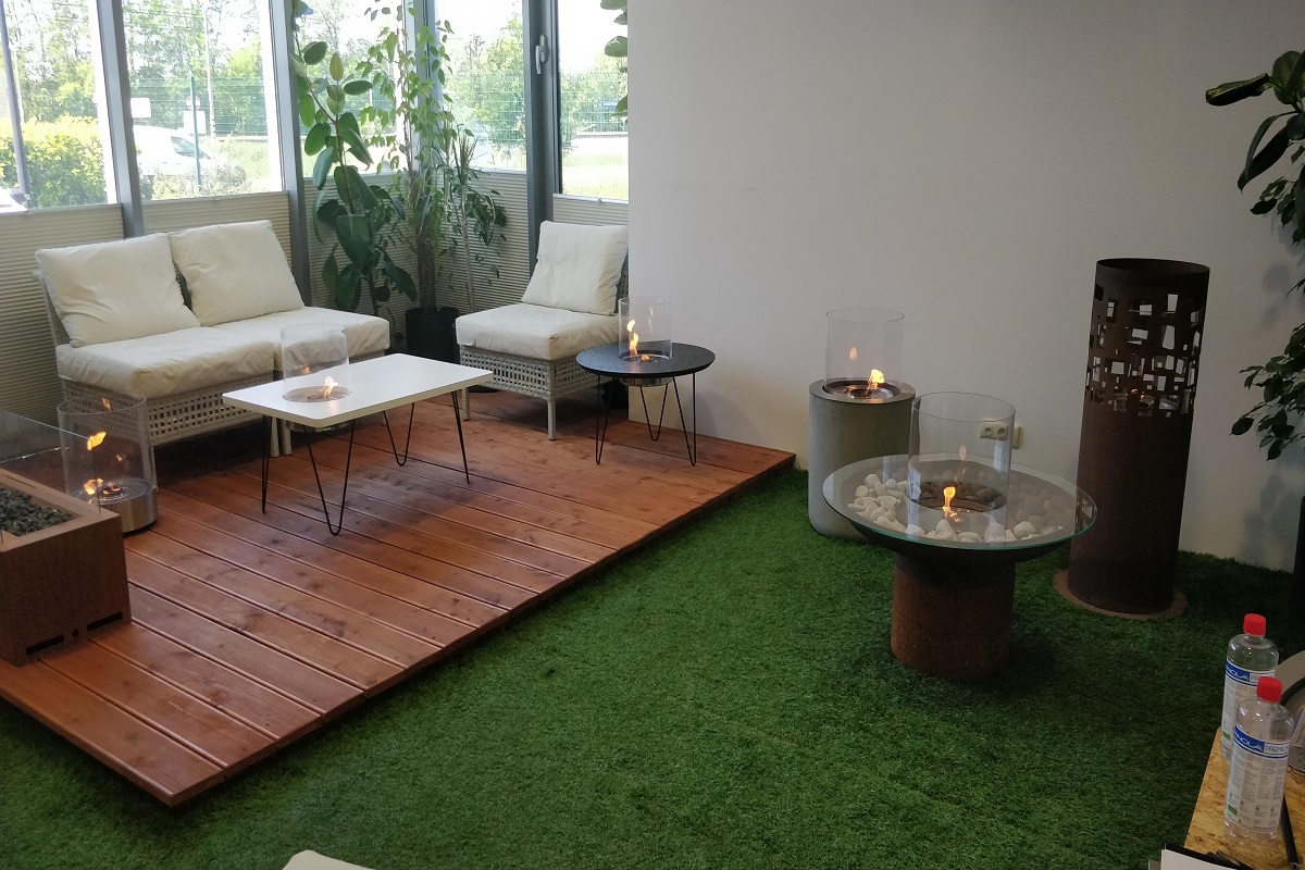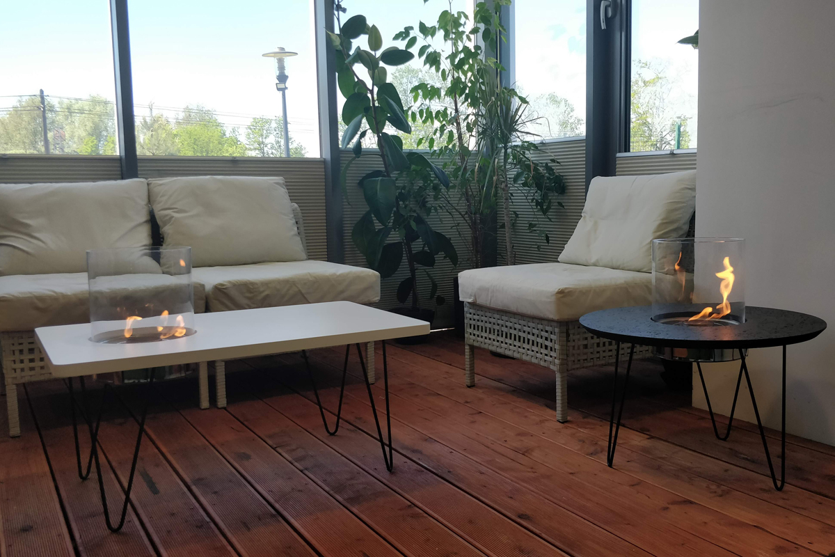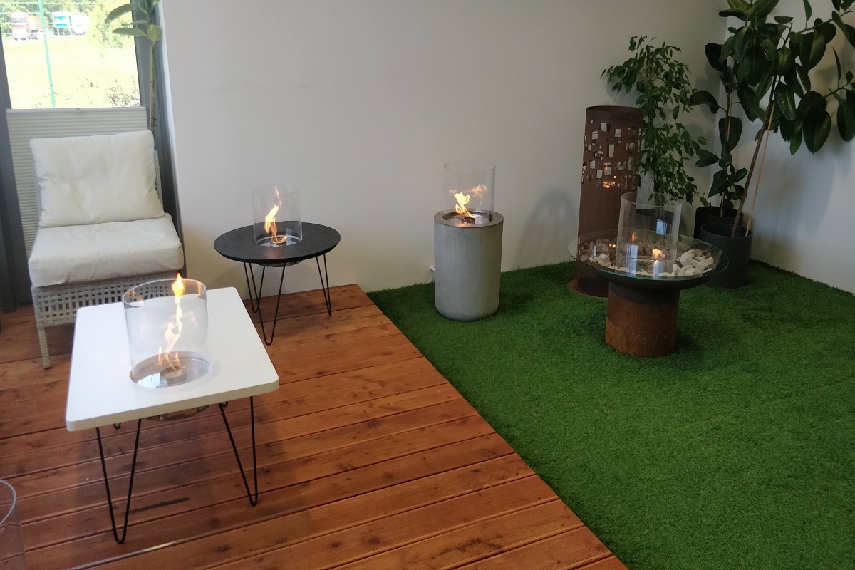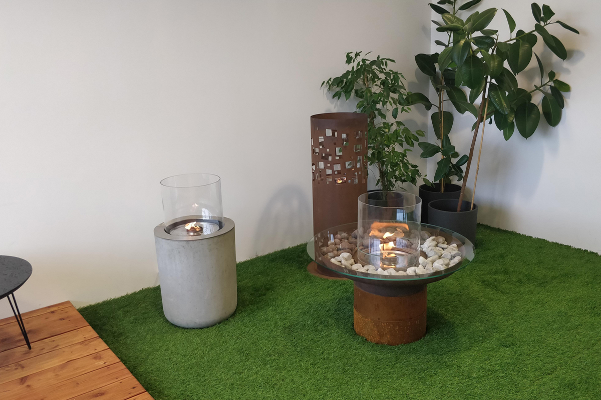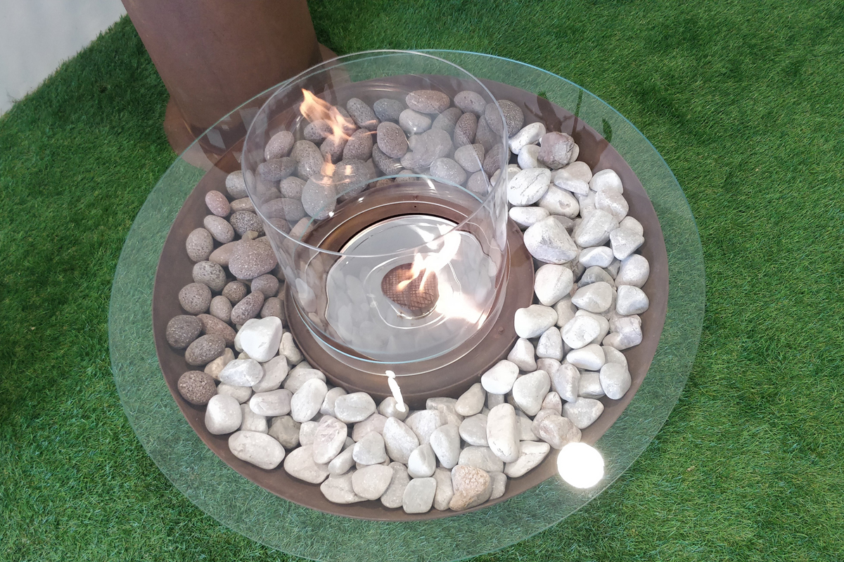 Еще одна особенность — биокамины столики имеют цилиндрические защитные абажуры из жаропрочного просветленного стекла, обеспечивающего им круговой обзор.