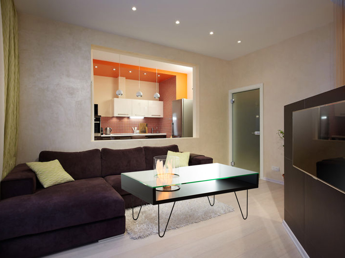 Столешница этого предмета мебели со встроенной этаноловой горелкой выполнена из ударопрочного стекла.