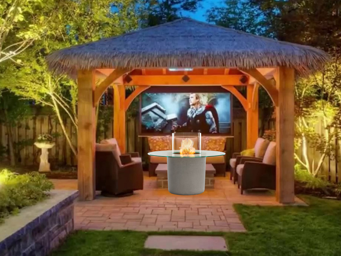 Круглая стеклянная столешница покоится на верхней поверхности бетонного корпуса биокамина. В центре возвышается прозрачный защитный колпак в форме цилиндра, он прикрывает пламя от порывов ветра и попадания посторонних предметов.