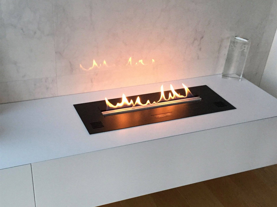 Пламя биокамина отражается на глянцевой поверхности мрамора, а в ночное время, при выключенном освещении, огни продолжат свою пляску и в большом панорамном окне, разбавляя огни ночного города.