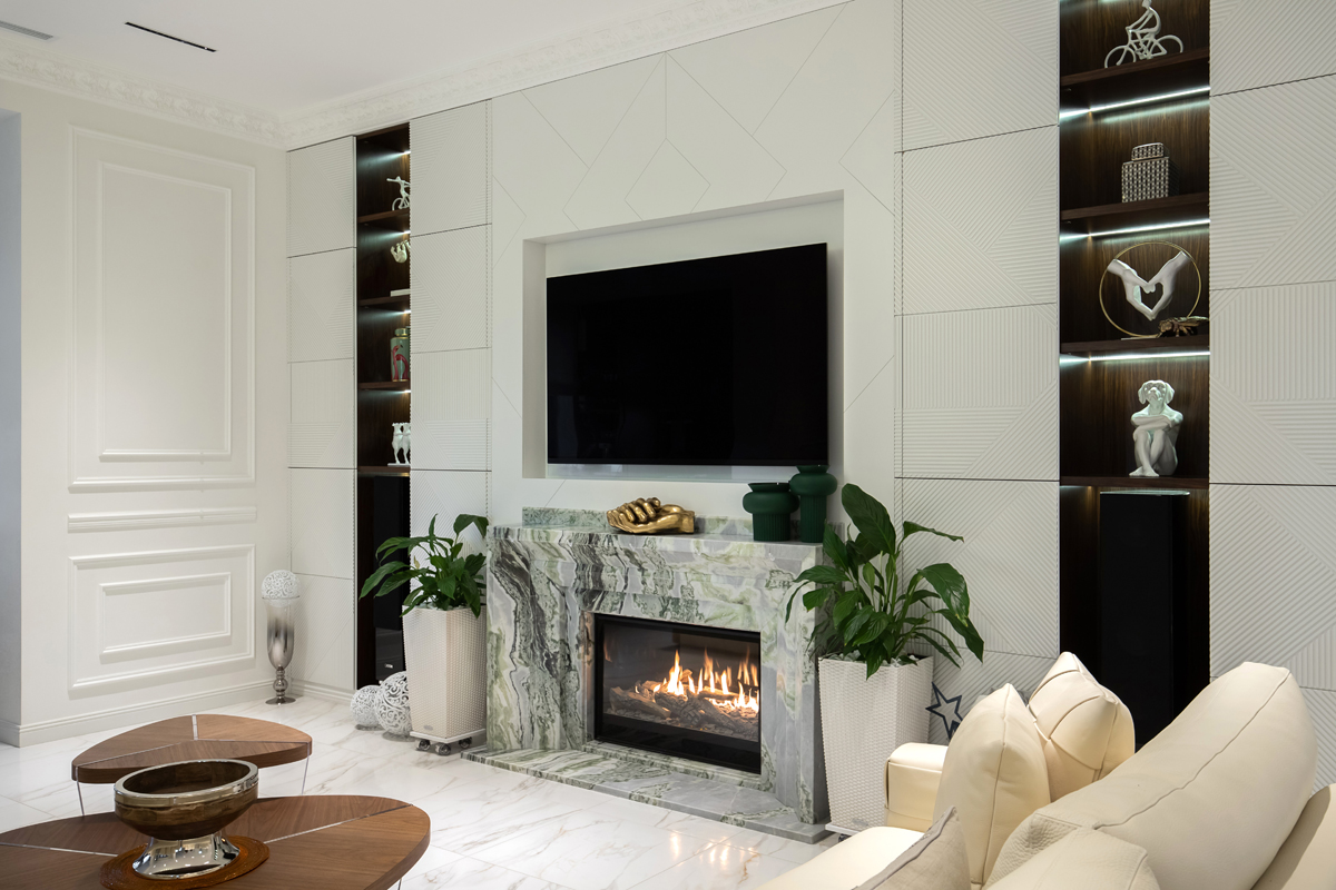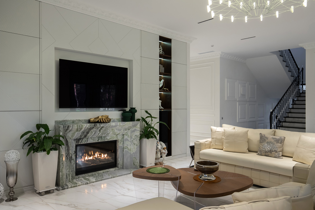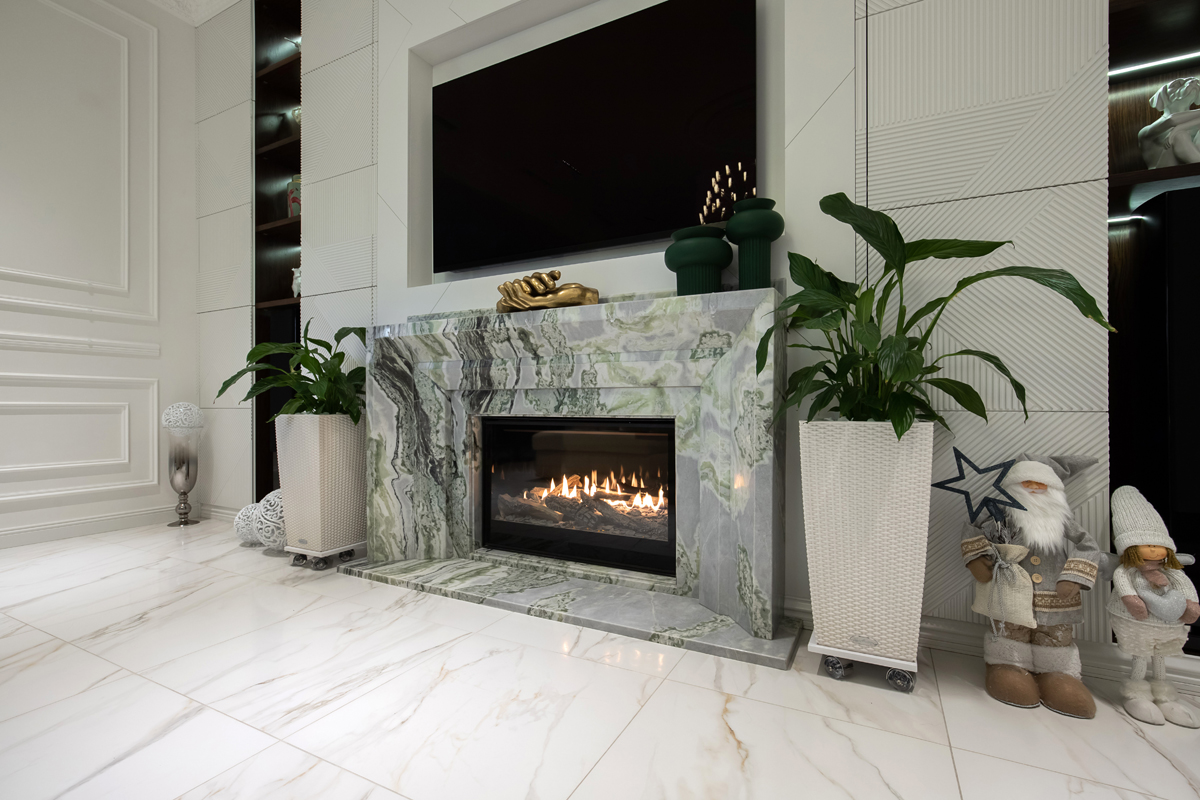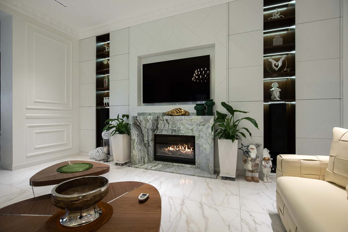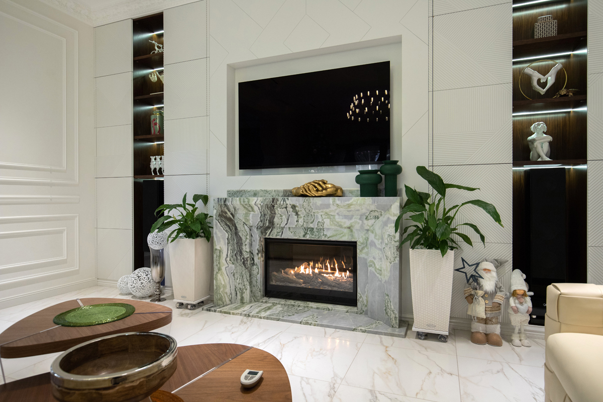В представленном проекте камин встроен в портал с классическим дизайном оформленный светлым мрамором.