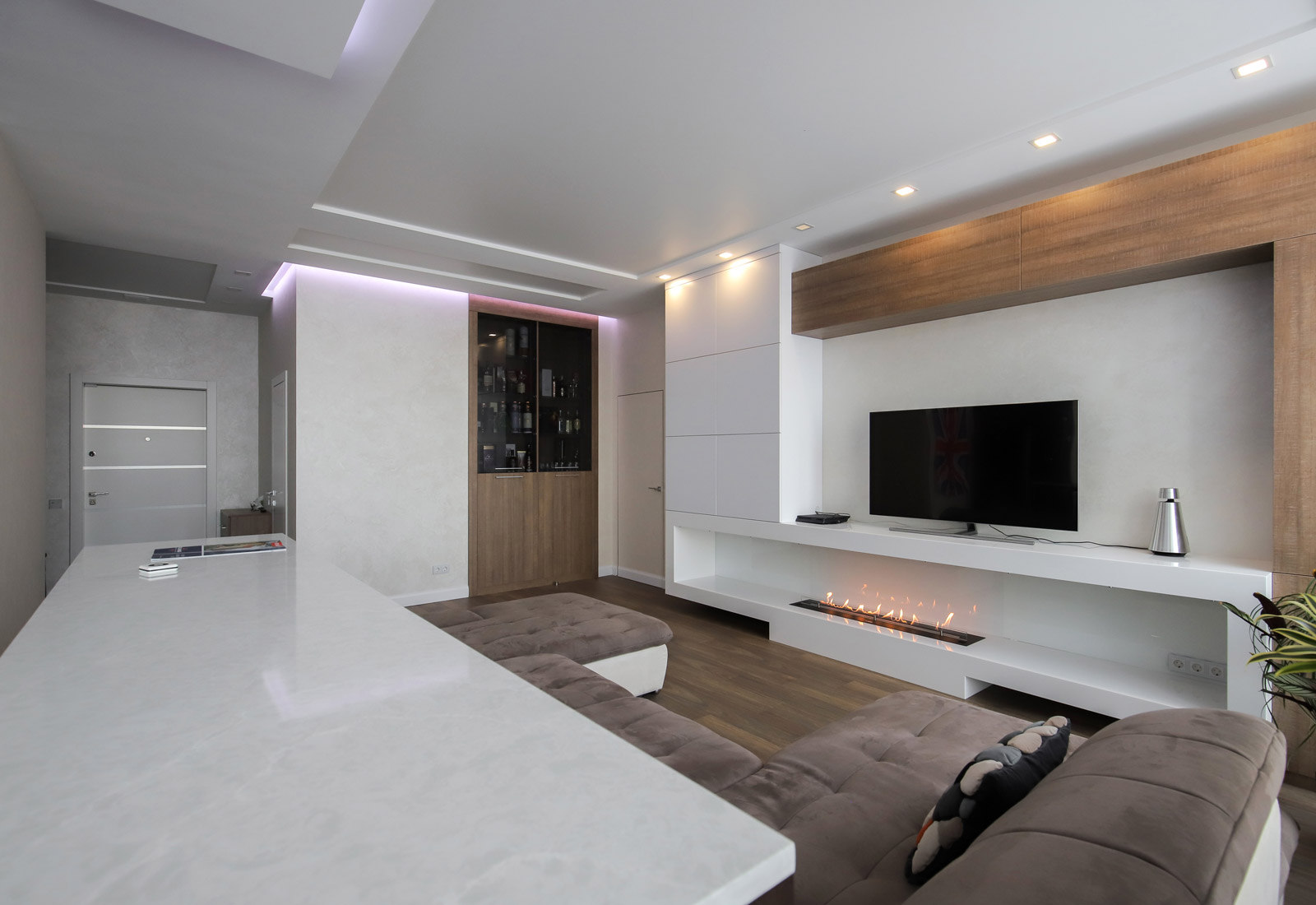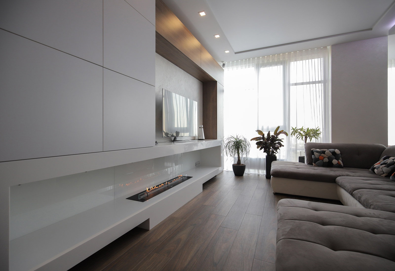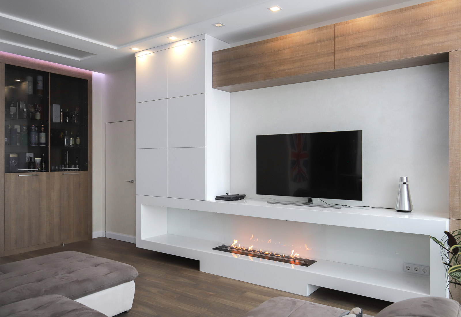 Интеллектуальная биоэтаноловая горелка встроена в нижнюю часть белоснежной мебельной стенки. Широкая ниша выполняет роль каминного портала, а также полки для всевозможных арт-объектов или книг, а также отделает пламя камина от еще одной ниши, в которой установлен телевизор.