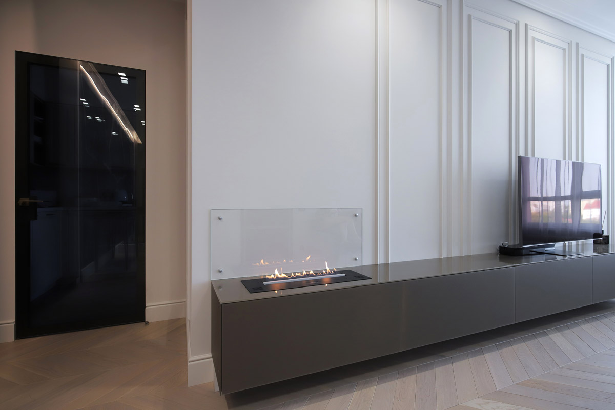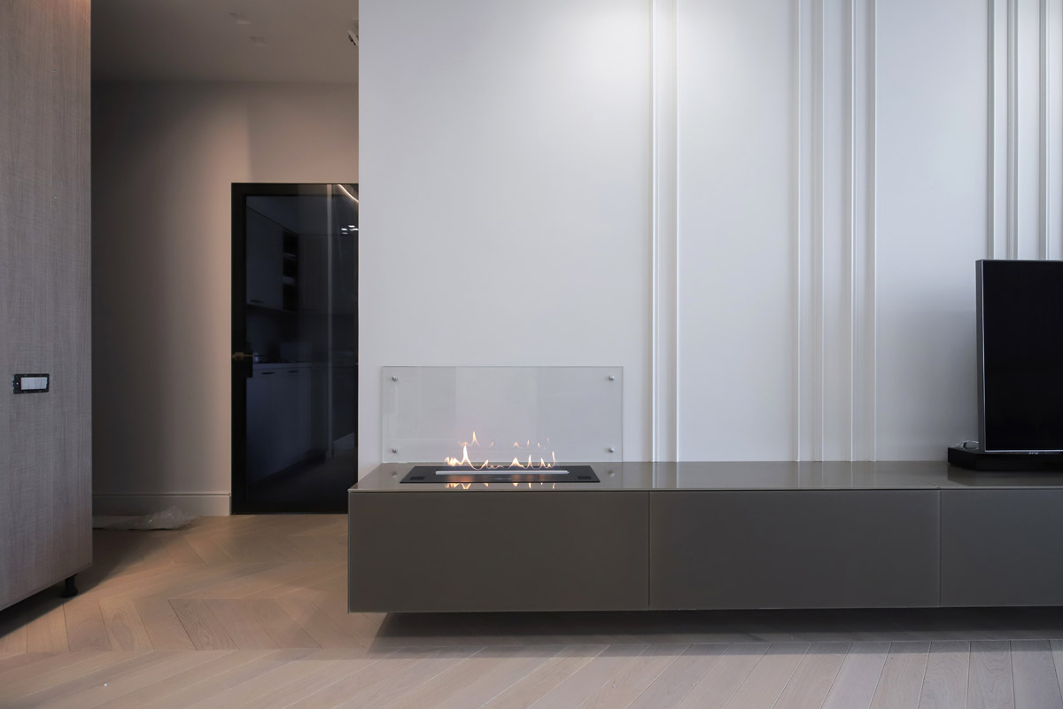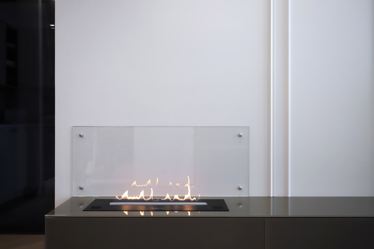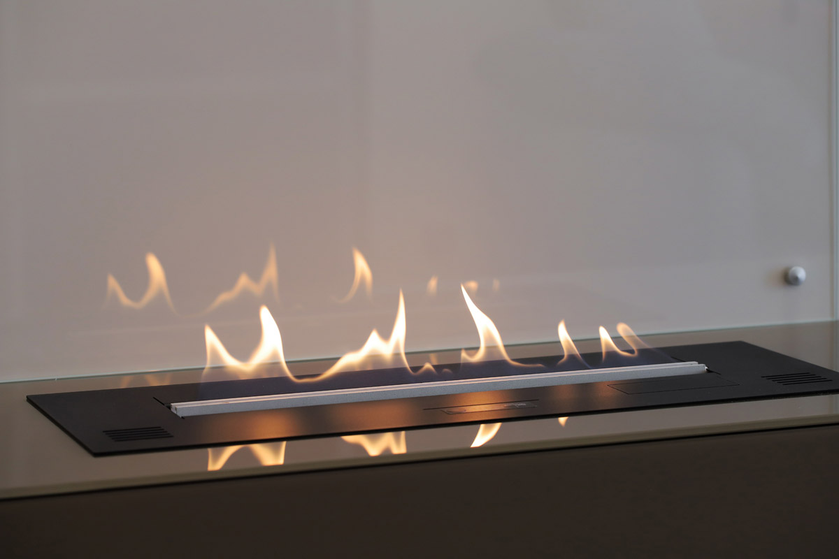 Часть стены за линией огня биокамина в противопожарных целях закрыта панелью из жаропрочного стекла. Глянцевая поверхность стекла и материала, которым пьедестал облицован сверху, отражают блики огня, придавая ему еще больше объема.
