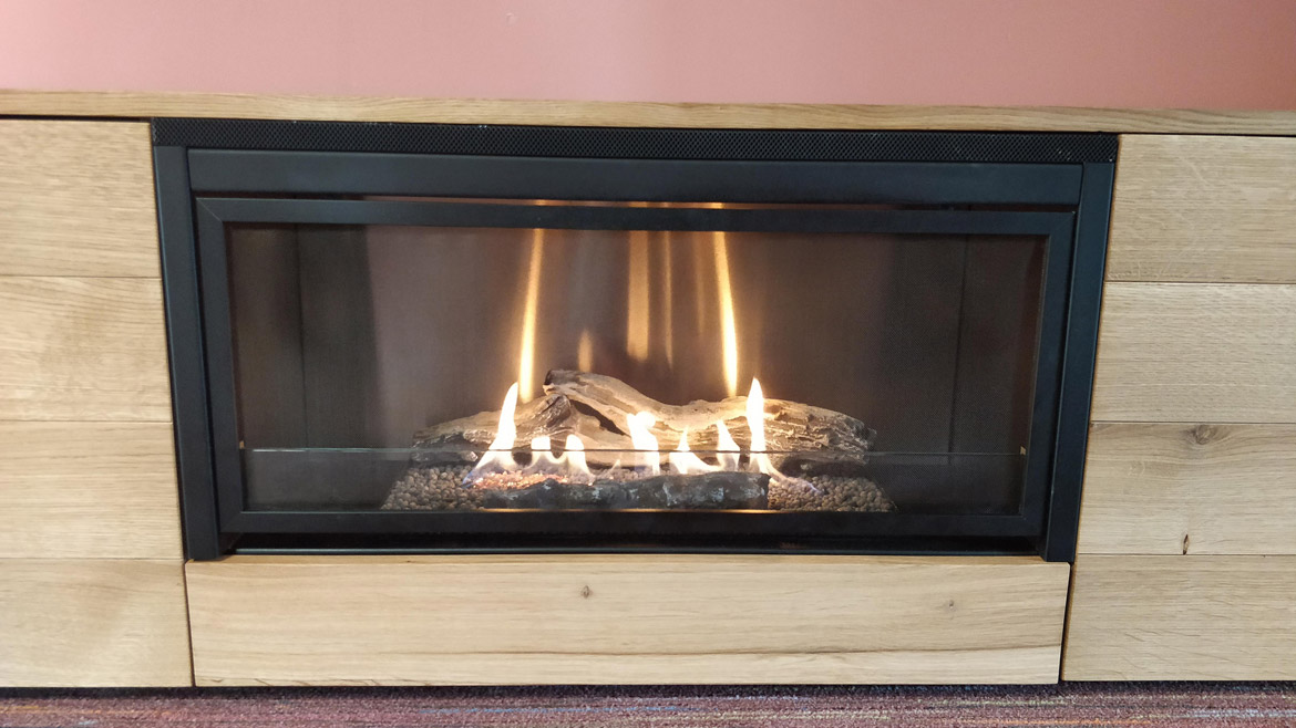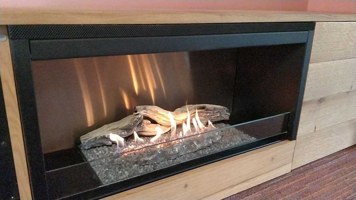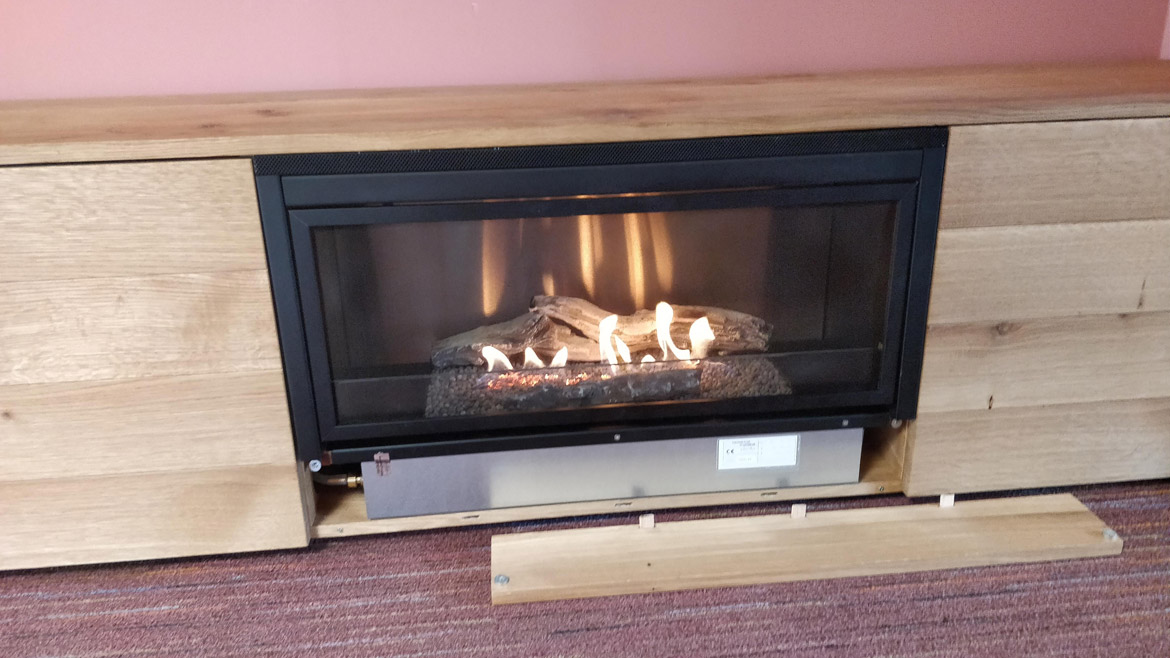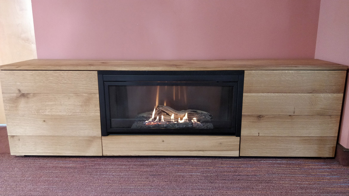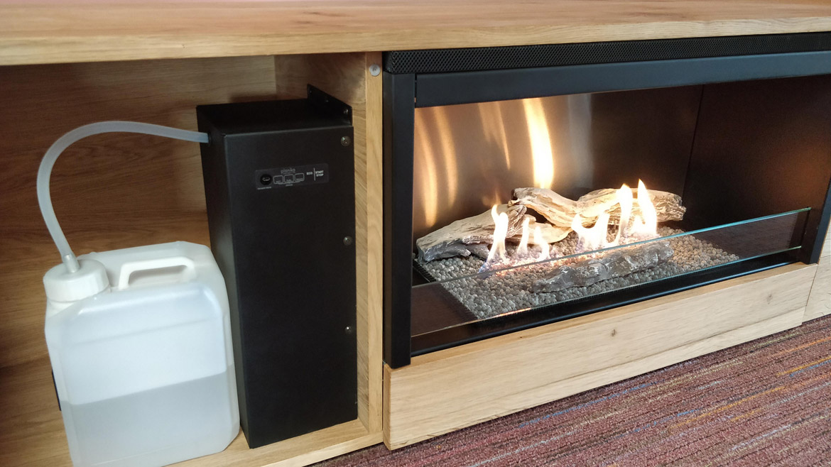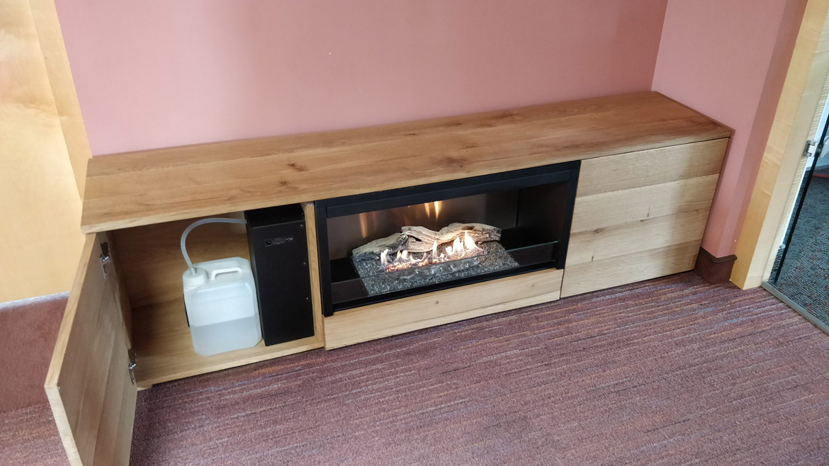 Бездымный камин встроен в центральной части подставки под телевизор, для чего был применен стальной монтажный короб черного цвета. Нагретый воздух выводится в помещение через вентиляционную решетку, расположенную в верхней части камина. Слева от горелки за дверцей прячется бак с топливом и панель управления, тут же можно хранить сопутствующие аксессуары.