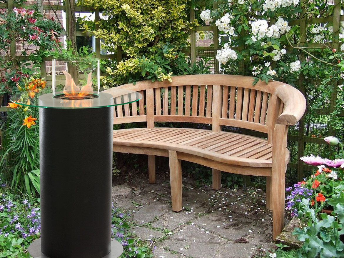 Так высокий биокамин Caro Table в виде цилиндрической черной колонны с колпаком защитного стекла на вершине, получил небольшую круглую столешницу, на которой запросто можно разместить чайные принадлежности.