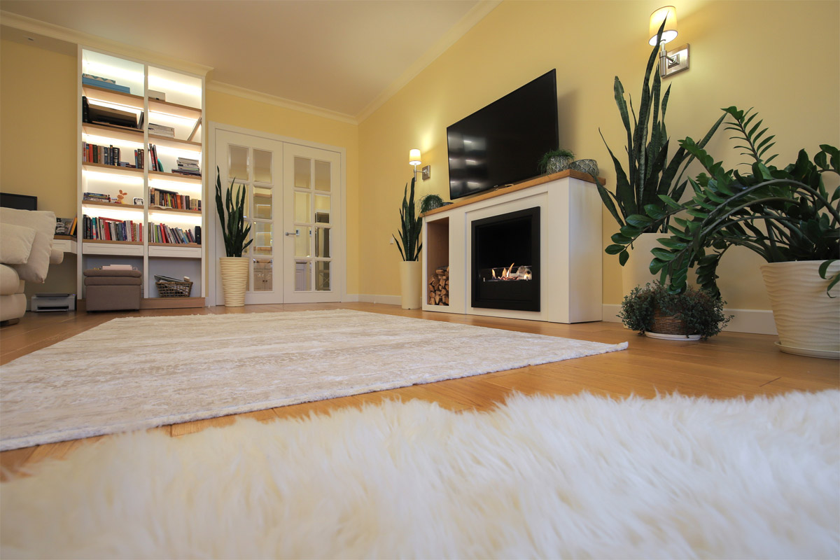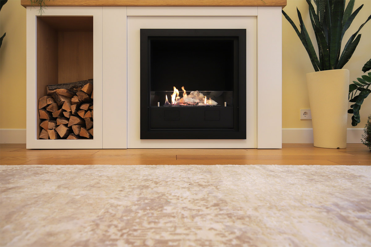 Интересным дизайнерским решением было сделать в каминном портале еще одно отделение для уже настоящих деревянных поленьев, которые только усиливают убежденность непосвященных людей в том ,что перед ними классических камин на дровах.