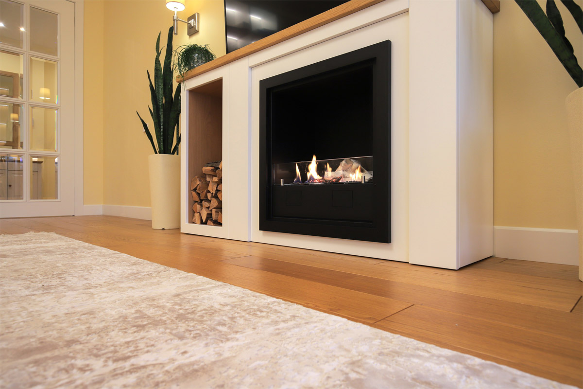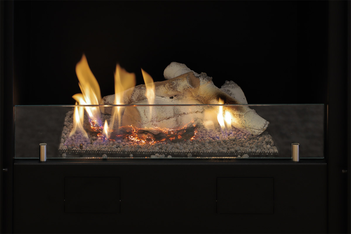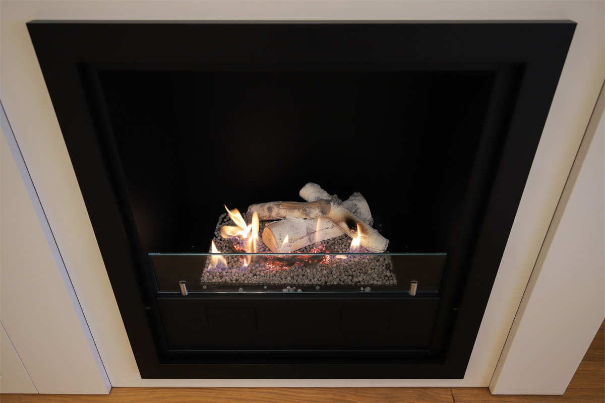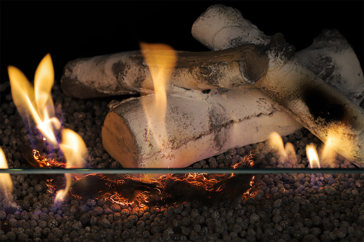 Отличительной чертой этого устройства от других встраиваемых бездымных каминов бренда, является оригинальная L-образная форма горелки, которая в сочетании с декоративными аксессуарами позволяет создавать инсталляции, превосходно имитирующие традиционные дровяные очаги.
