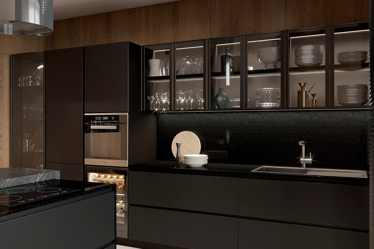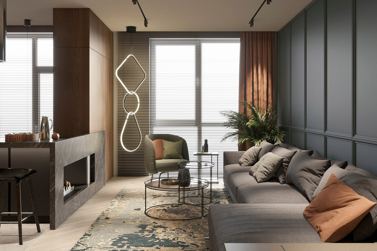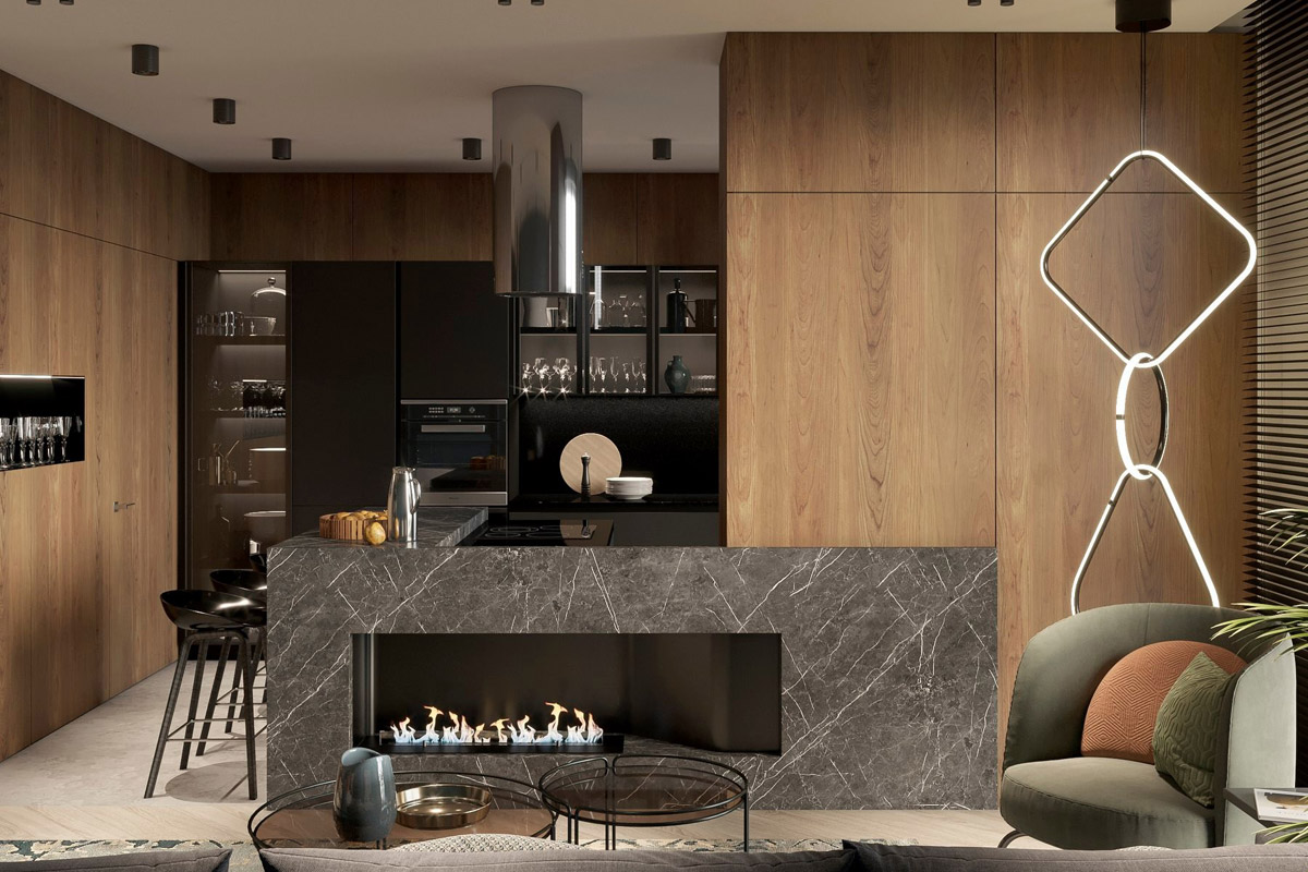 В проекте используется биокамин PRIMEFIRE с длиной линии огня 1000 мм. Источник живого огня с автоматикой встроен в конструкцию, которая является еще и разделителем пространства, отделяющим кухню от зоны отдыха.
