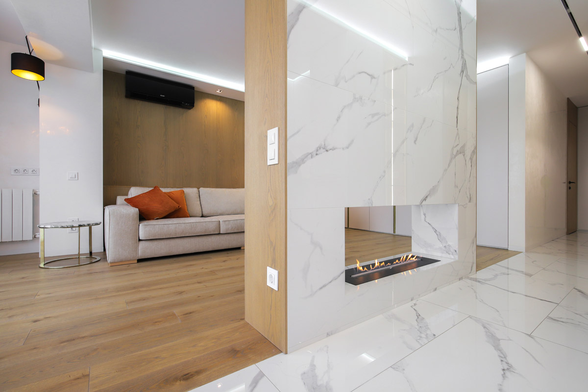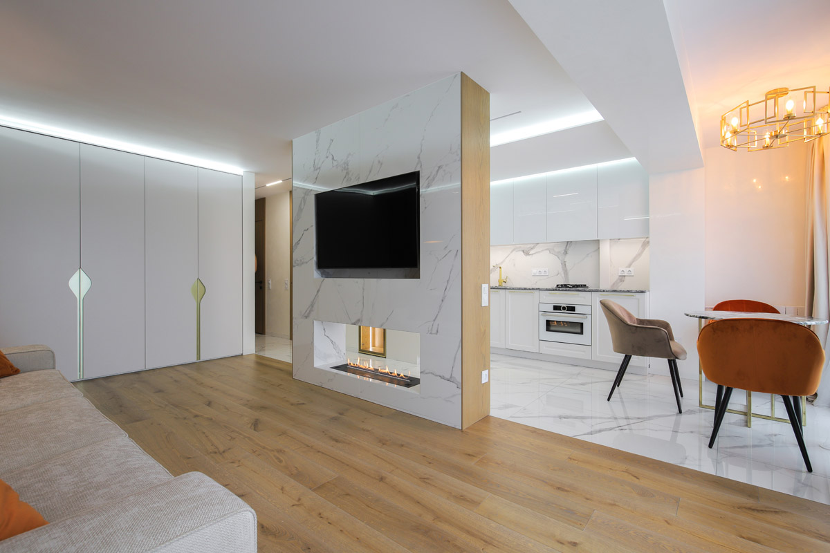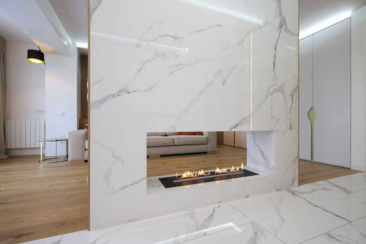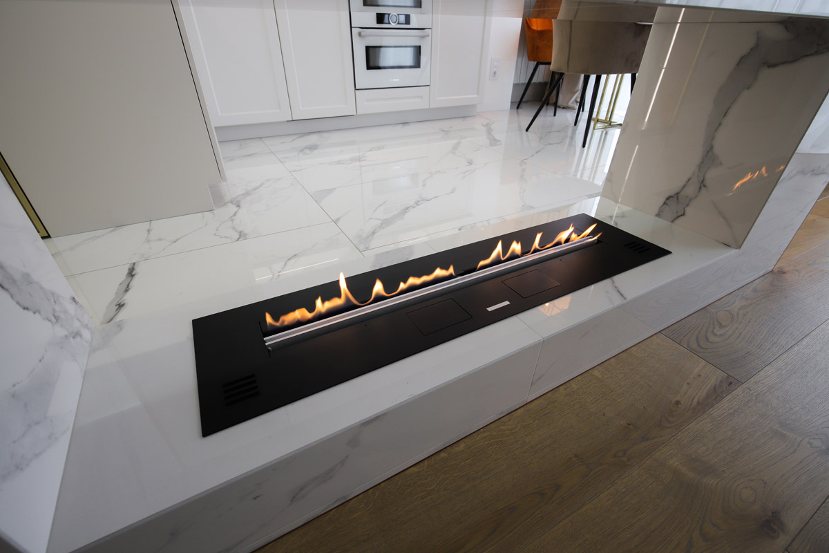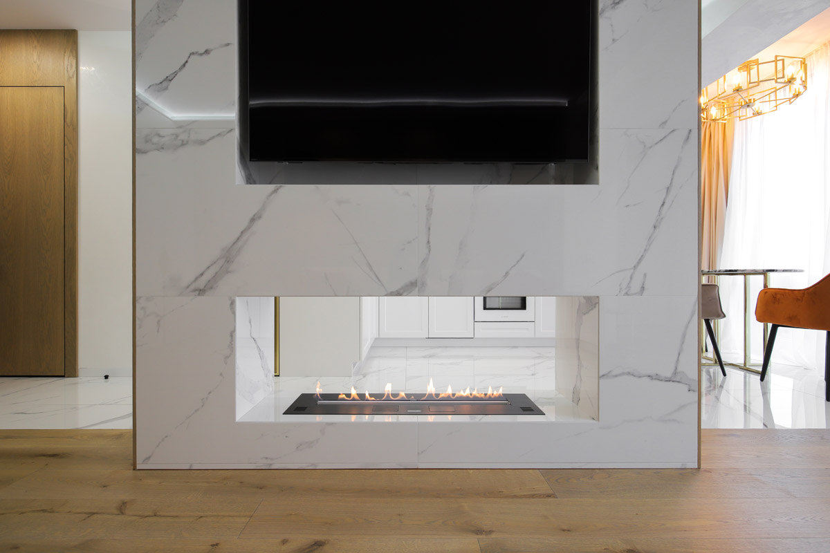 Биокамин, размещенный в сквозной нише, получил доступ к обеим локациям, даря свой огненный танец и тем, кто отдыхает в гостиной, и тем, кто готовит или кушает в кухне.