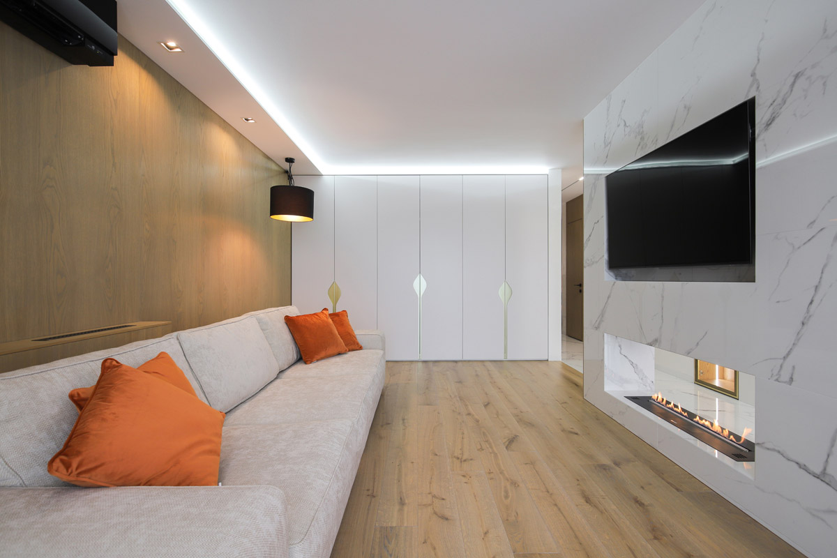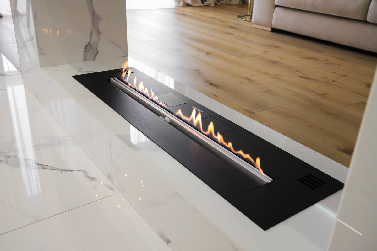 Автоматический биокамин FLA 2 MODEL Е, который для данного интерьера выбран в качестве источника живого огня, инсталлирован в сквозную нишу.