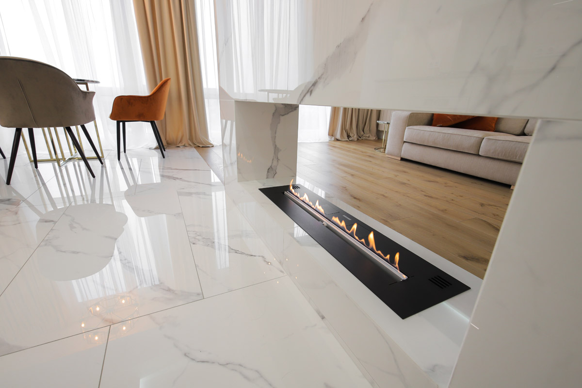 Черная верхняя панель биокамина контрастно смотрится на фоне облицовки светлым мрамором. Чистое биоэтаноловое пламя гарантирует простоту ухода за устройством, отсутствие твердых остатков после сгорания топлива (пепел, сажа, копоть), означает, что для поддержания чистоты достаточно периодической влажной уборки.