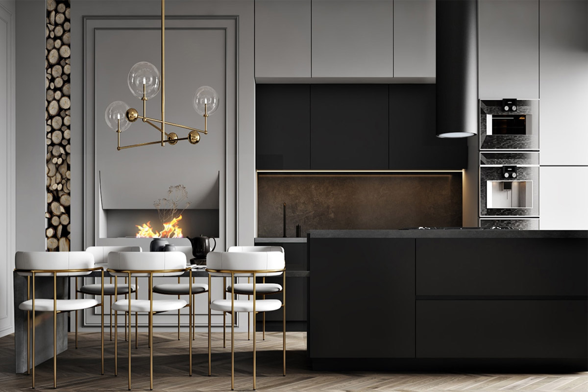 Биокамин в мебели на кухне, находится на стыке стилей. С одной стороны, он традиционный декоративный элемент классического интерьера, с другой, его современная автоматизированная «сущность» тяготеет к модерну.