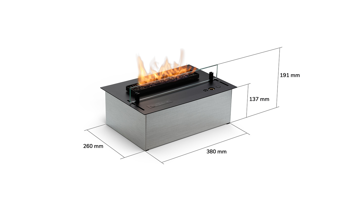 Емкость топливного бака биокамина составляет 1,3 литра, что позволяет поддерживать горение на протяжении 4,5 часов (максимальная тепловая мощность– 1,9 кВт). Влиять на скорость расходования горючего можно выбирая один из двух режимов горения: стандартный и Eco.