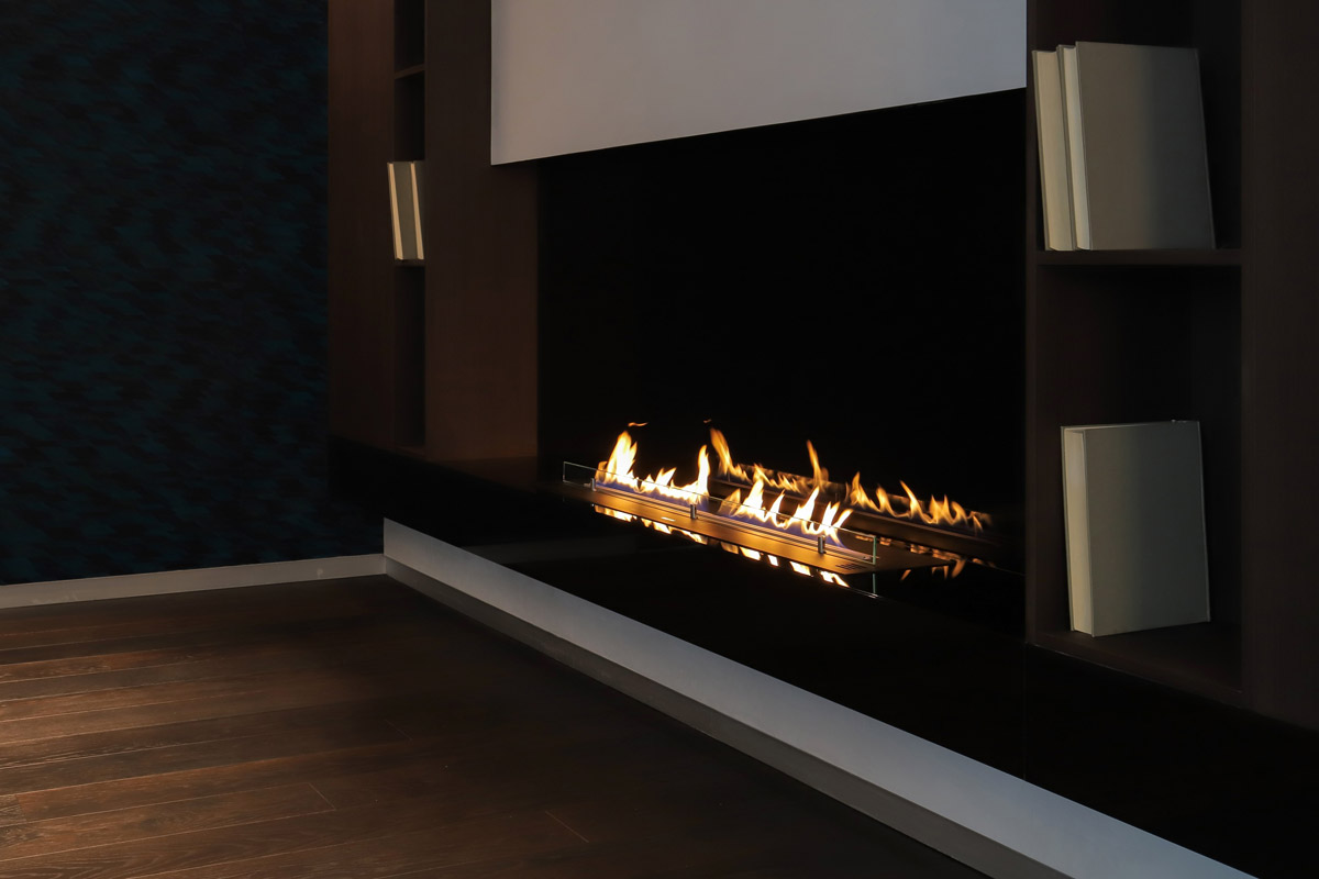За линией огня стена отделана негорючим материалом с глянцевой поверхностью, в которой отражаются блики огня, добавляя ему объем.