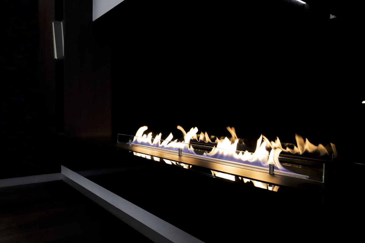 Бездымный польский камин на этаноле встроен в выступающий из стены пьедестал. На фоне черной стены яркое пламя смотрится, как бриллиант на контрастной бархатной подушке.
