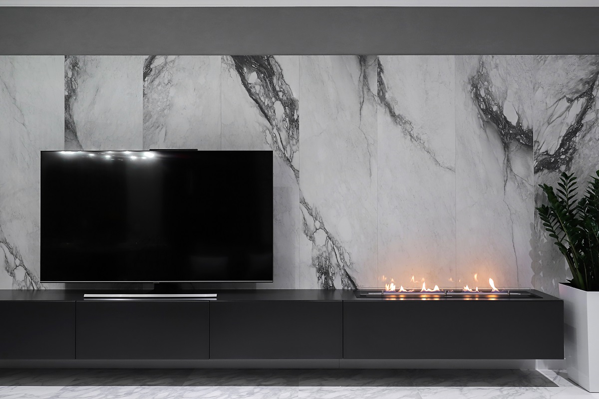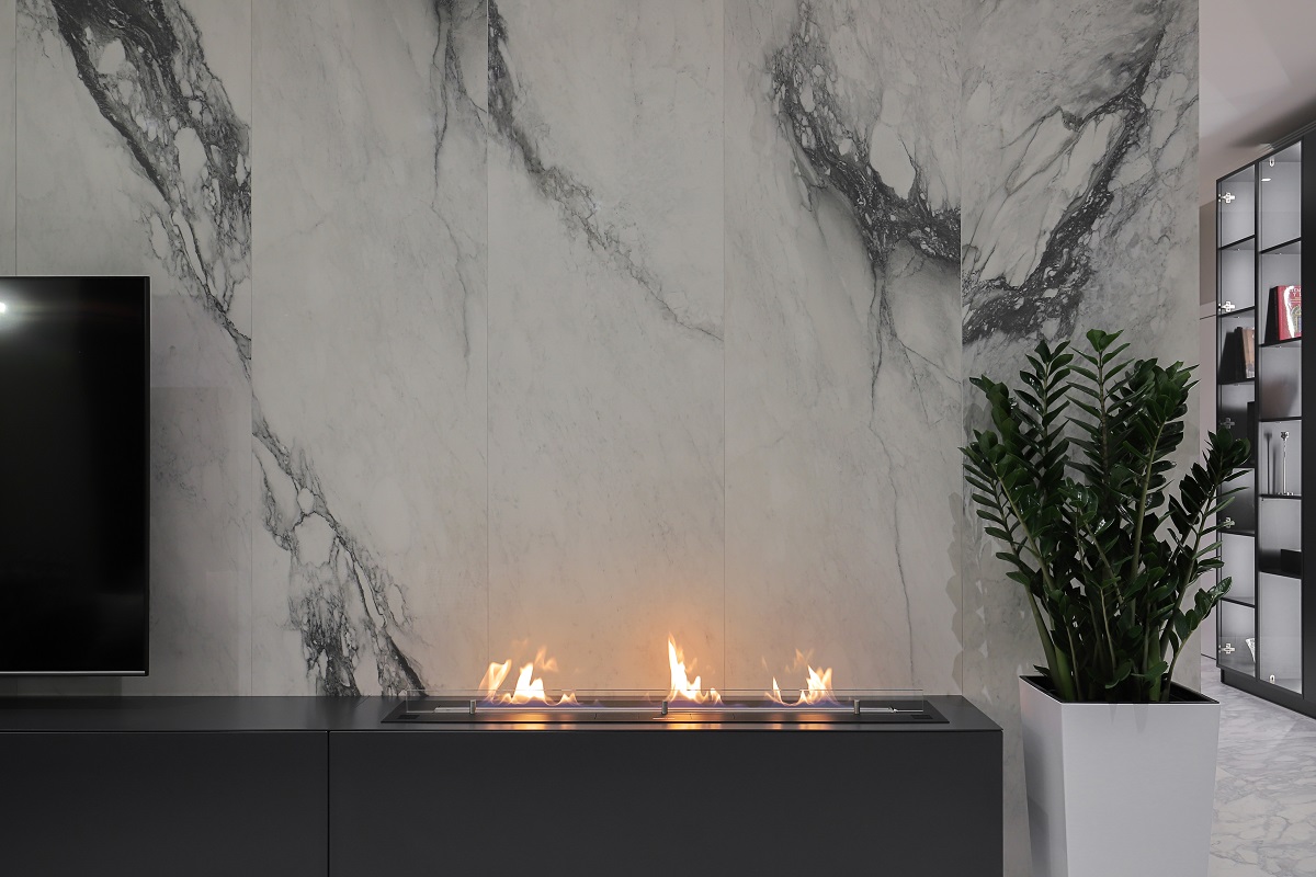 Конструкция встроена в подвешенную на стене мебельную консоль, при этом линия огня остается открытой для обозрения с трех сторон.