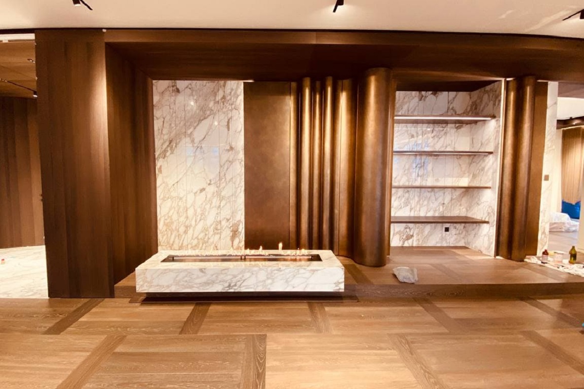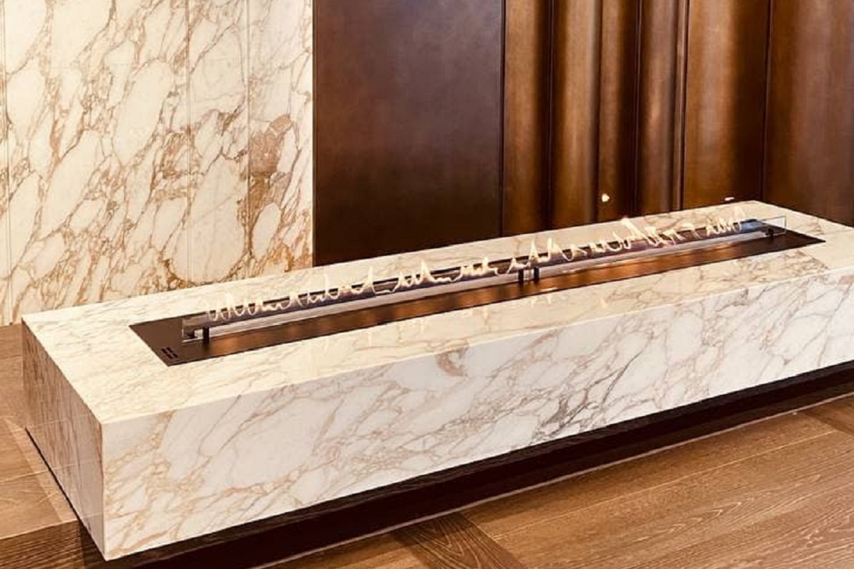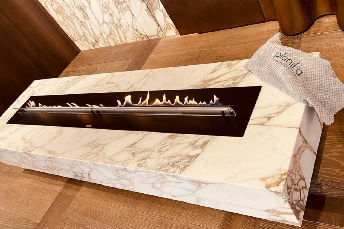 Флагманский биокамин Planika Fire Line Automatic 3 для этого проекта был изготовлен под заказ в размере 1880 см и инсталлирован в пьедестал с отделкой из мрамора.