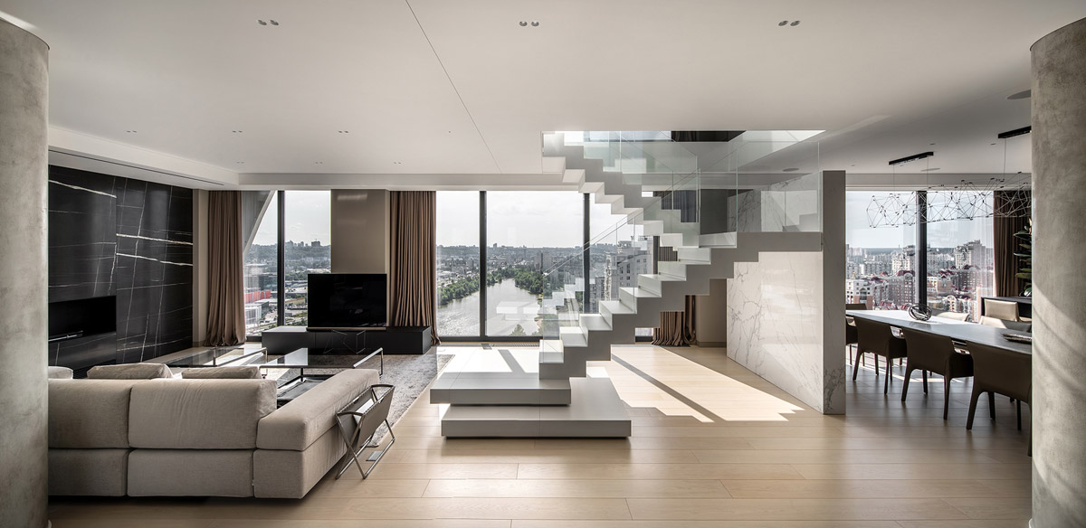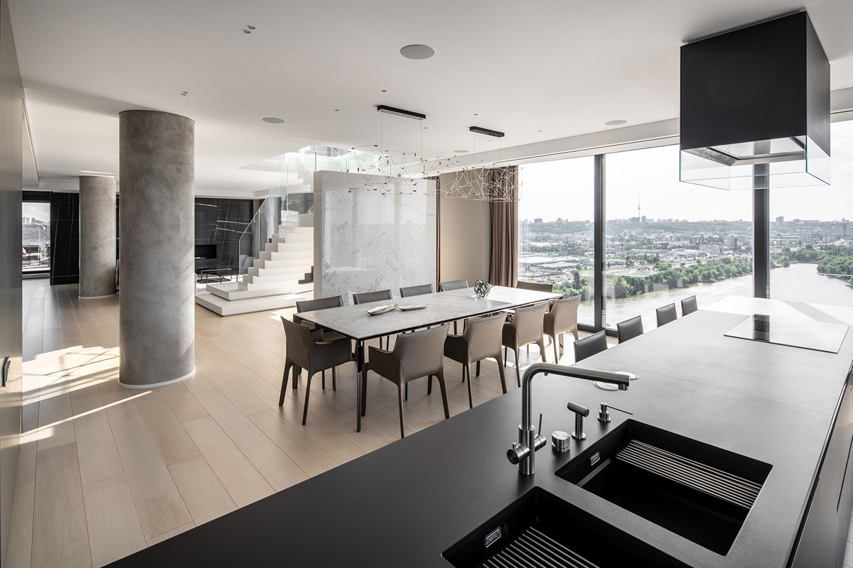 Когда у тебя заказ на создание дизайна интерьера трехэтажной квартиры на набережной Киева, кажется, «эх, сейчас развернемся, ведь столько пространства». В таких хоромах и биокамин с линией огня в три метра может затеряться. Только сегодня минимализм не только модный тренд, но и современная философия жизни, даже среди людей с высоким уровнем дохода.