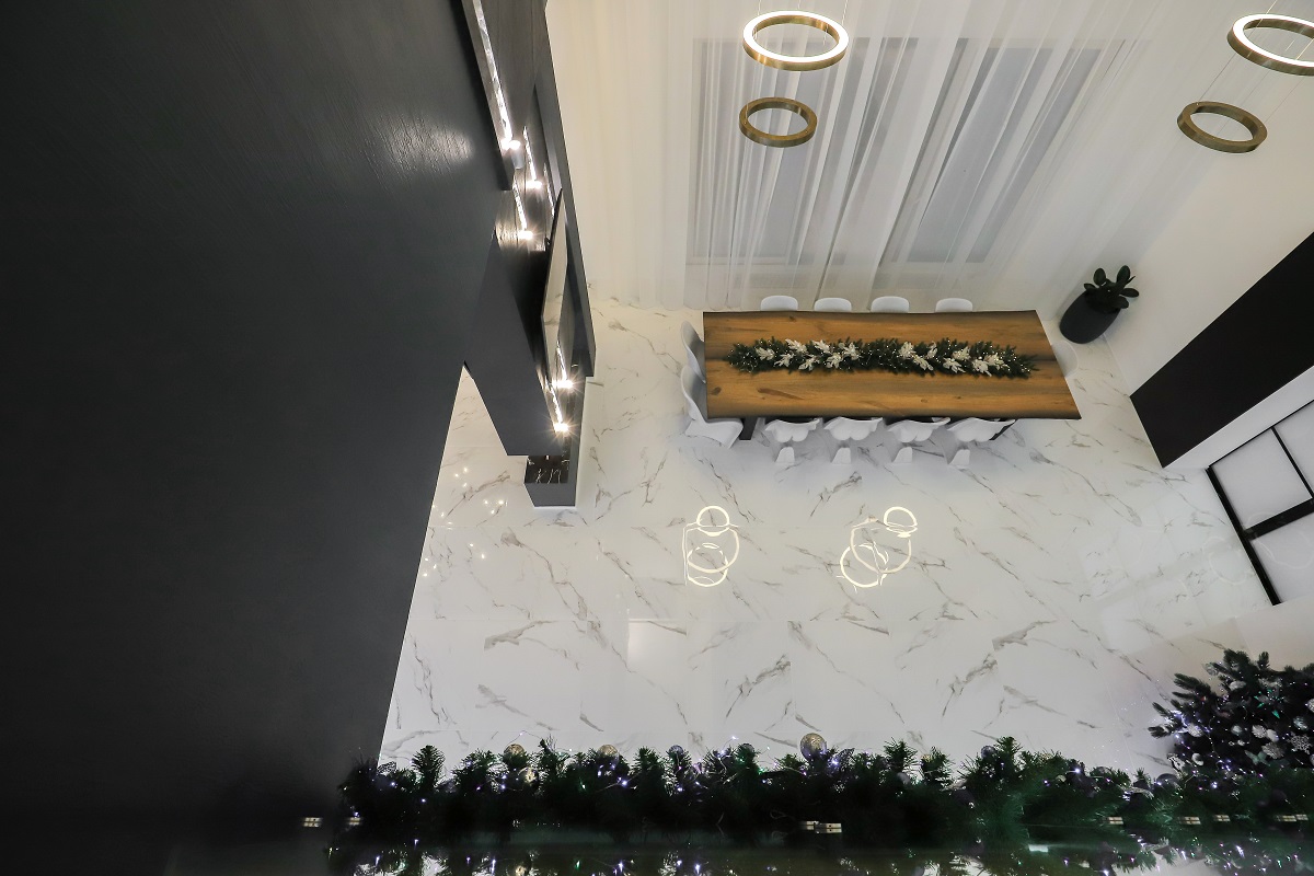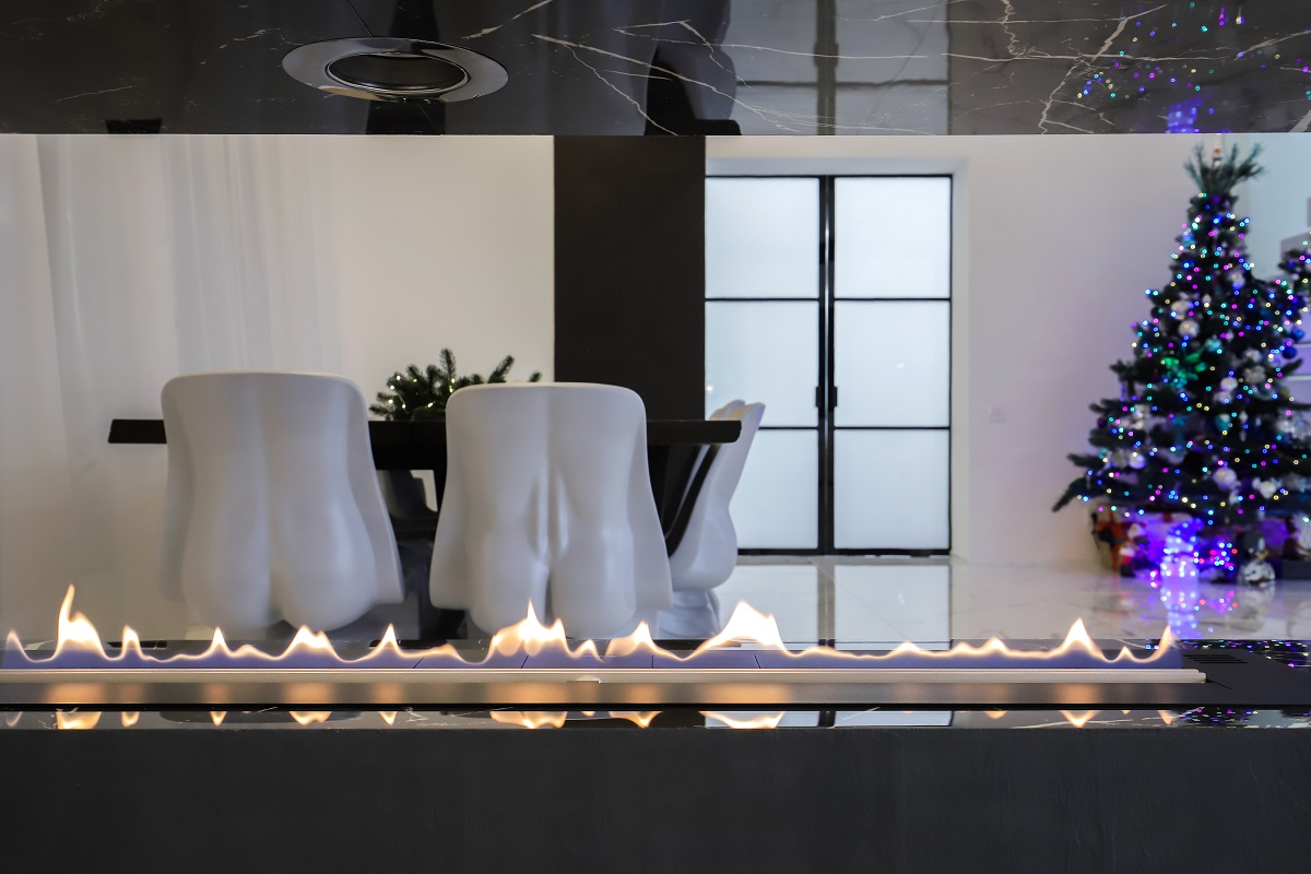 Біокамін встановлений у нижній частині роздільника простору. Конструкція перегородки (наскрізний тунель плюс відкрита бічна сторона) дозволяє милуватися полум’ям каміна одночасно з трьох сторін, що в умовах великих площ відкритого простору і розумно і красиво.