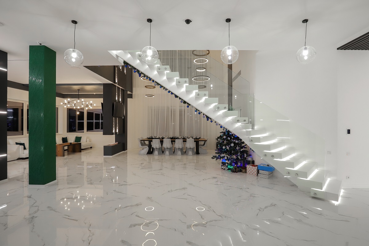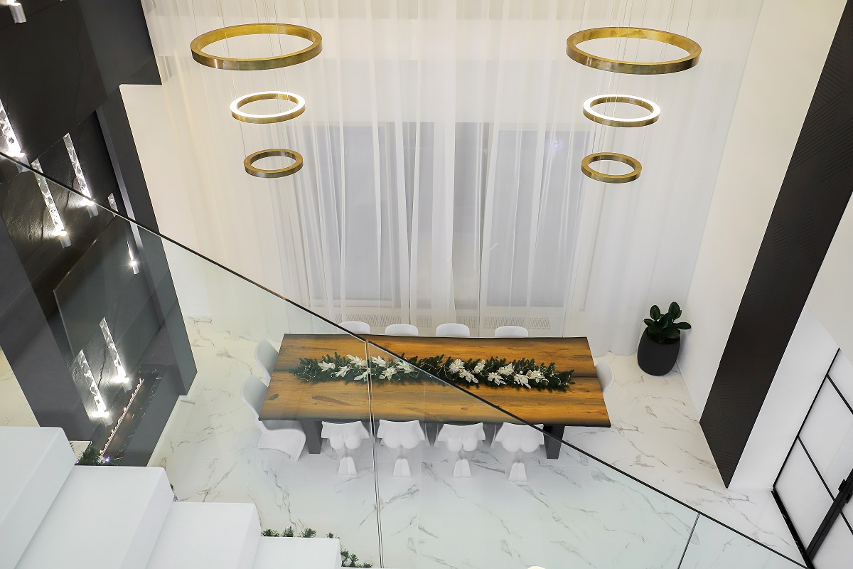 На фото інтер’єр проектуванням та реалізацією якого займався професійний дизайнер Сергій Пастух. У просторому open space просторі першого поверху Сергій використовував автоматичний біокамін Primefire у перегородці, що відокремлює їдальню від зони відпочинку.