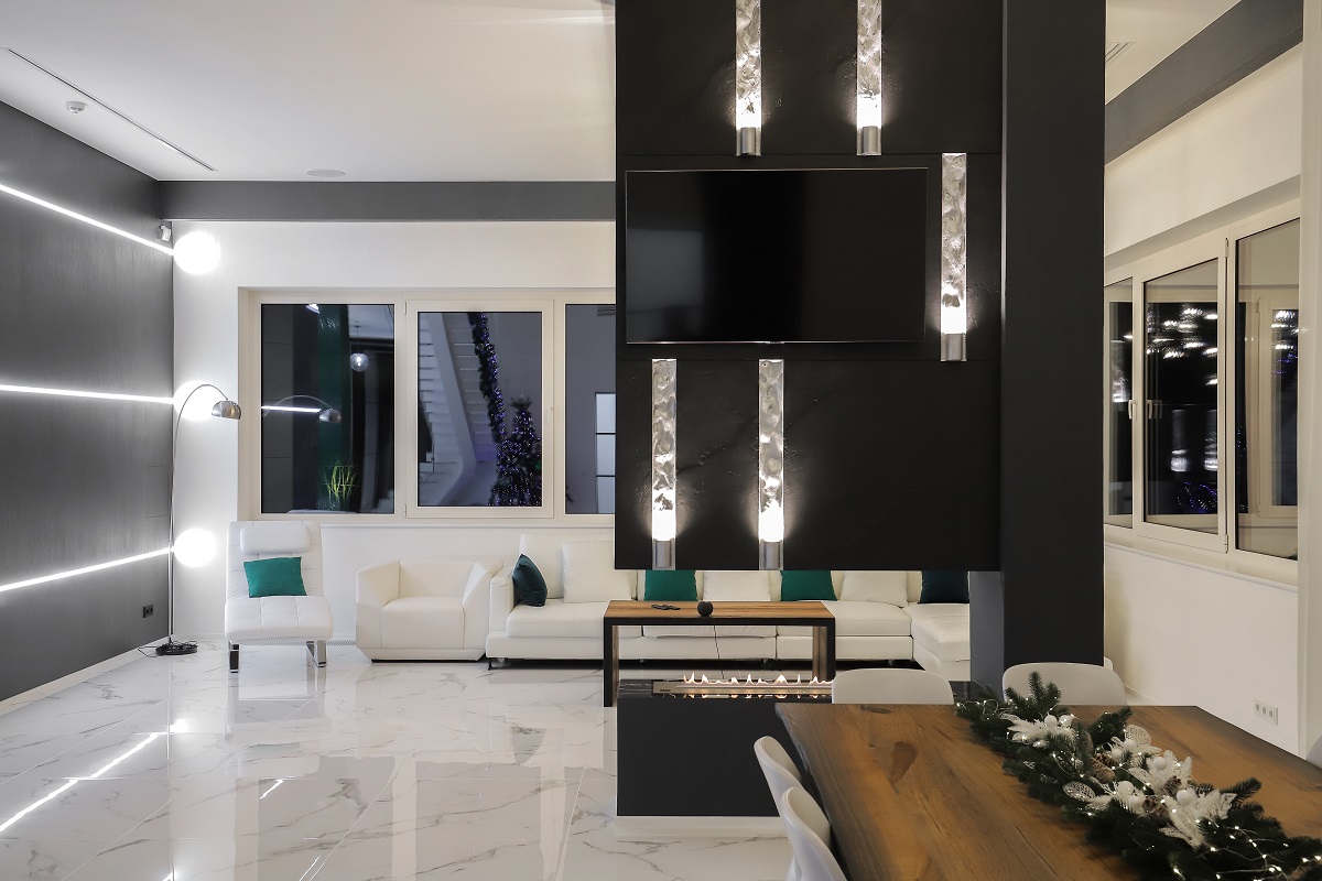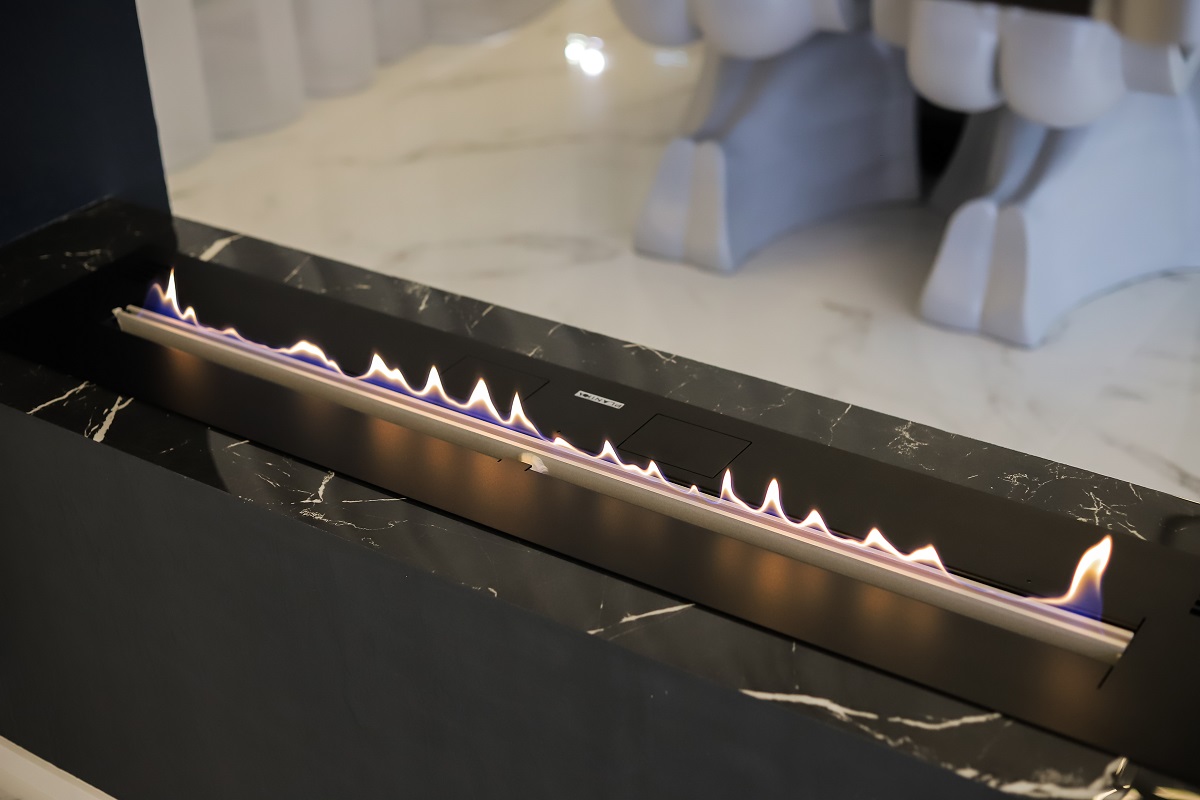 В інтер’єрі оформленому в переважно світлих тонах, темна міжкімнатна перегородка, в яку вбудований біокамін Primefire, стала найпомітнішим акцентом ансамблю. Для даного проекту використовувалася найкомпактніша модель з лінійки Primefire з довжиною лінії вогню 990 мм, при необхідності дизайнер міг взяти пальник і великих розмірів, аж до того, щоб об’єднати кілька біокамінових модулів між собою, що інженерно передбачено виробником.