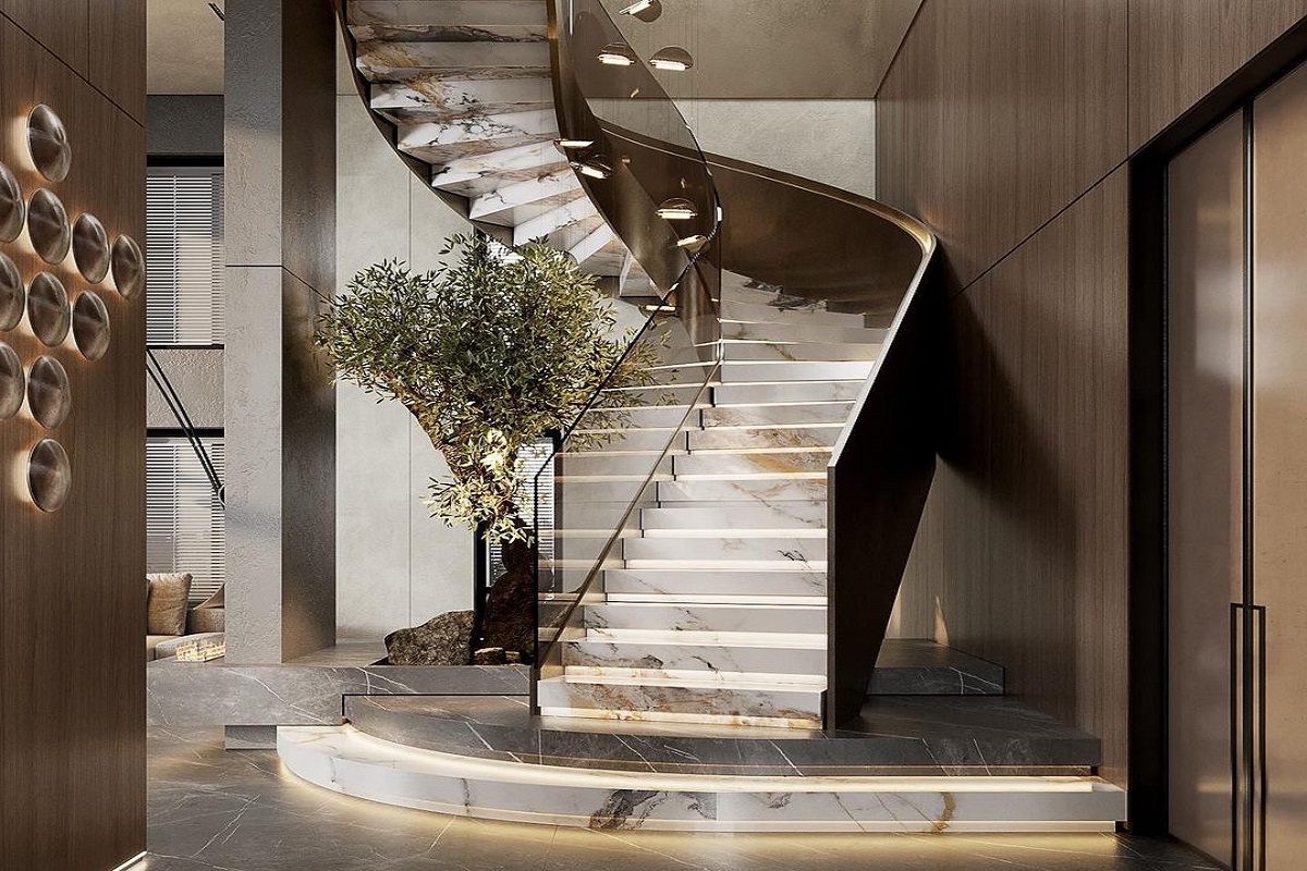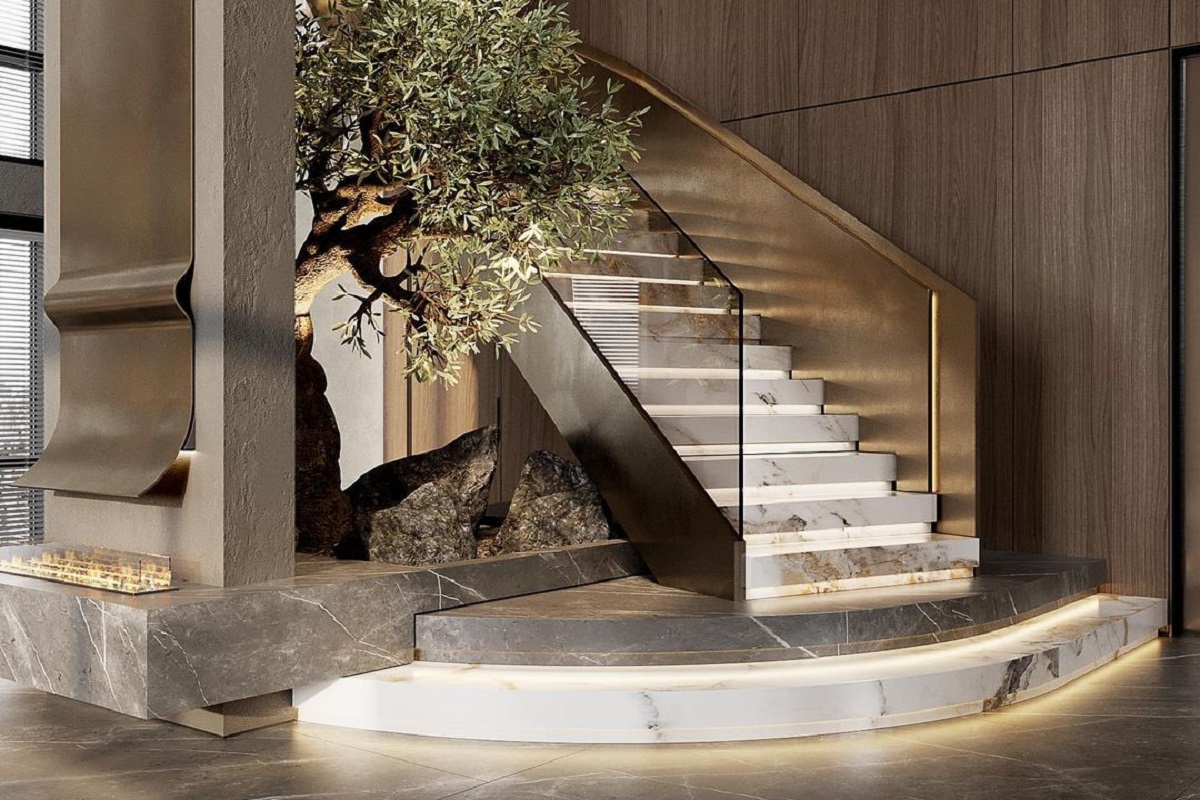 Зверніть увагу на встановлення збоку від сходів. Автоматичний біокамін Planika вбудований у широку консоль, що кріпиться на певній відстані від підлоги до високої колони. Гнутий металевий лист на колоні імітує димар, який, звичайно, не потрібен біоетаноловим камінам, але надає цьому пальнику вигляду традиційного каміна.