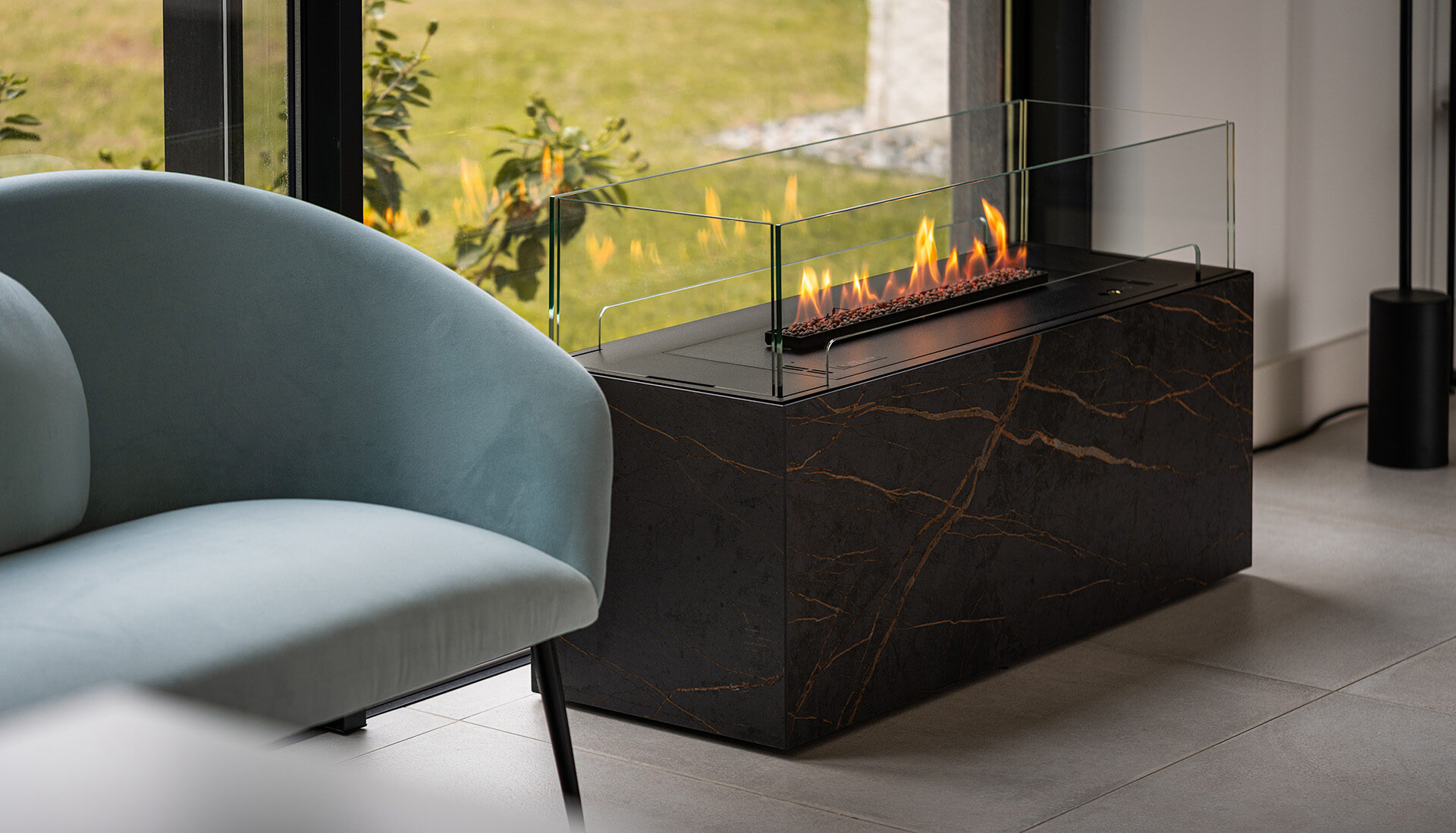 Корпус біокаміна виконаний з матеріалу Dekton від Cosentino. Цей штучний матеріал виробляється шляхом сплавлення кераміки, скла та кварцу і зовні схожий на мармур. Завдяки унікальним властивостям матеріалу корпус каміна став стійким до подряпин, забруднення, високих температур.